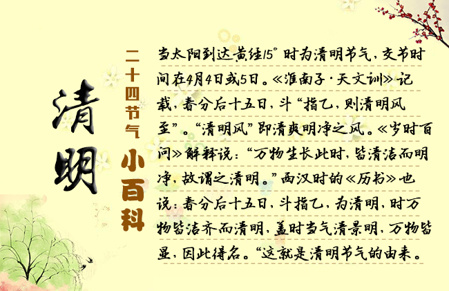 節(jié)選自《二十四節(jié)氣志》/宋英杰 4月5日前后為清明節(jié)氣,氣清景明之意,正是鳥語花香的盛春時節(jié)。“言萬物去故而從新,莫不鮮明之謂也?!薄叭f物生長此時,皆清凈明潔,故謂之清明?!鼻迕髦惚碚髁诉@一時節(jié)的天氣是清新、明媚、和暖的。