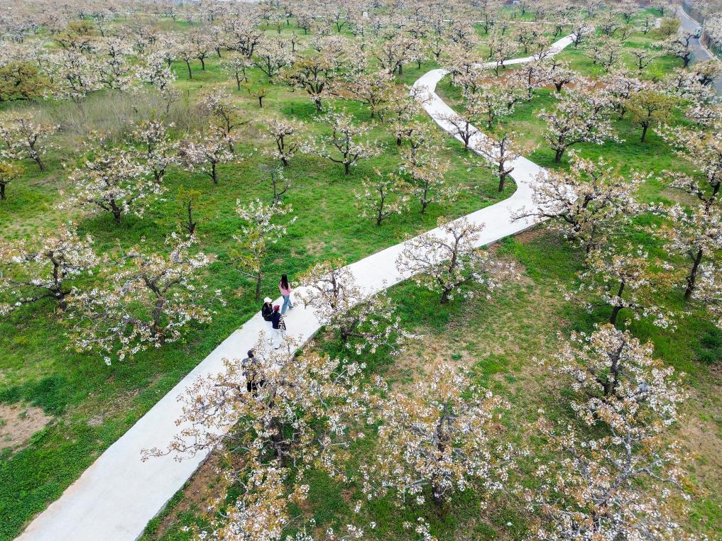 4月3日,游客在梨園內賞花(無人機照片)。時下,山東省滕州市柴胡店鎮(zhèn)近萬畝梨園進入盛花期,梨花競相綻放。新華社記者 朱崢 攝