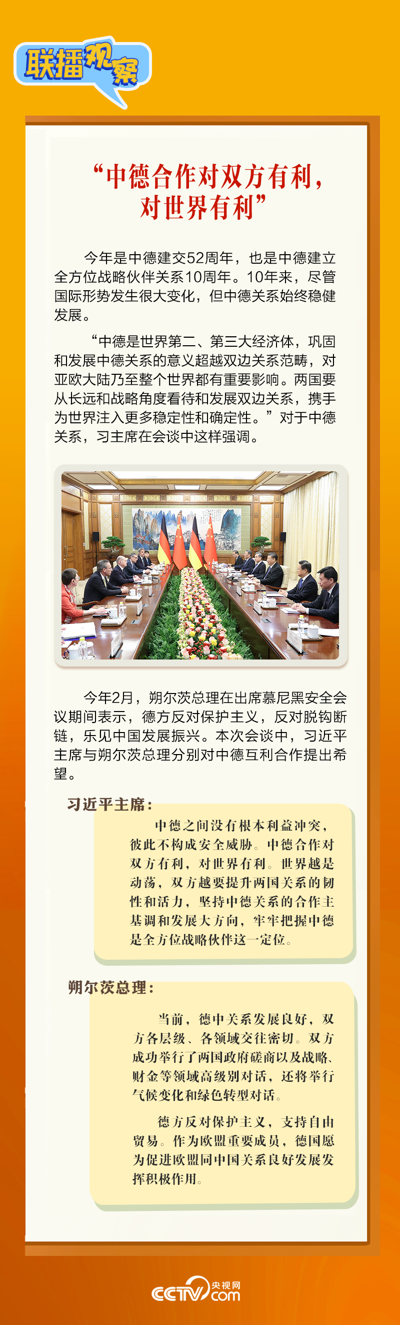 4月16日上午,習(xí)近平主席在北京釣魚臺國賓館會見朔爾茨總理。會見中,習(xí)主席強調(diào),要“牢牢把握中德是全方位戰(zhàn)略伙伴這一定位”。中德建立全方位戰(zhàn)略伙伴關(guān)系10年來,兩國如何共同發(fā)展,相互成就?央視網(wǎng)《聯(lián)播觀察》帶您了解。