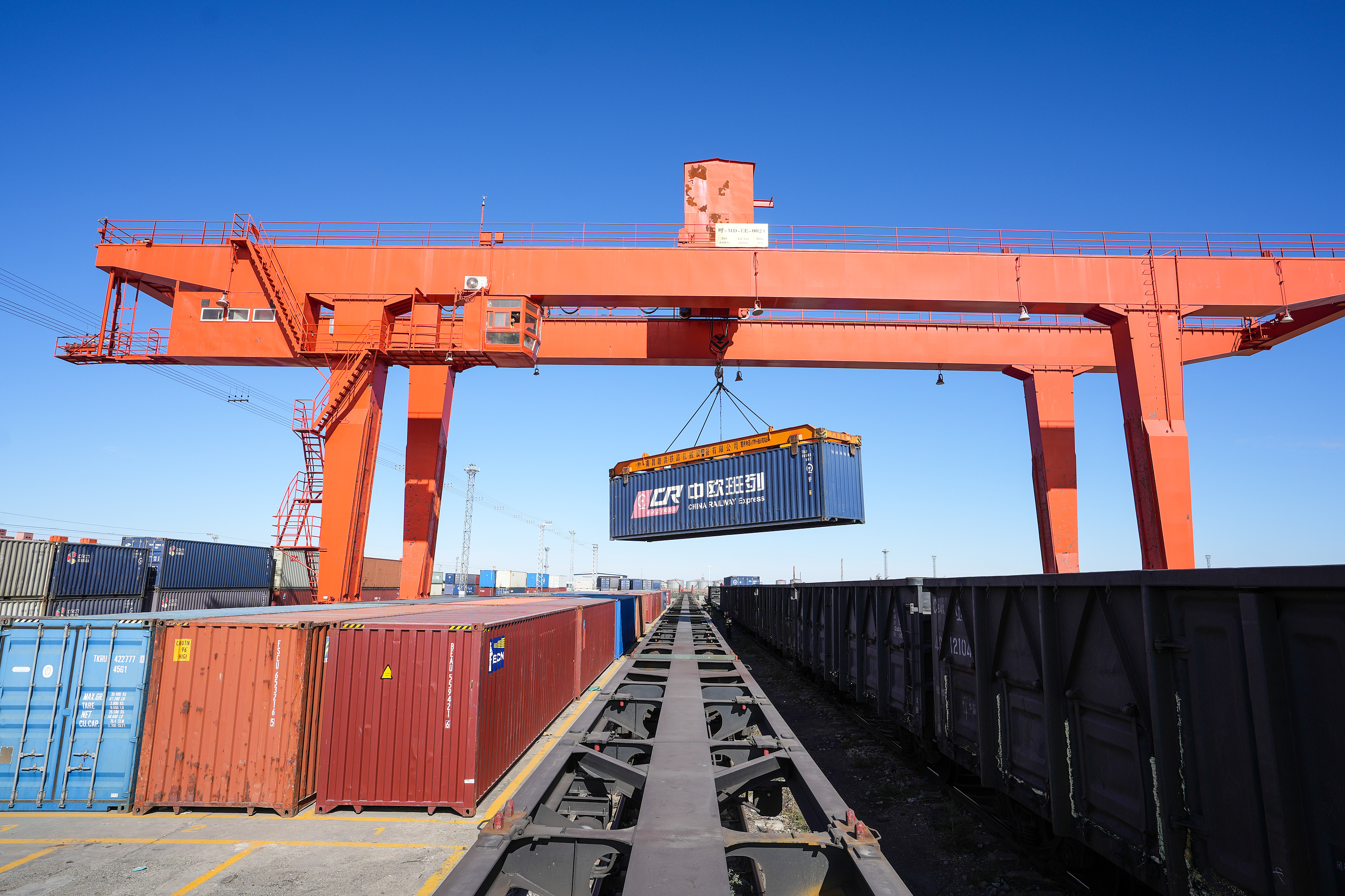 △ 內(nèi)蒙古錫林郭勒二連浩特口岸鐵路貨場內(nèi),龍門吊正在吊裝中歐班列集裝箱。