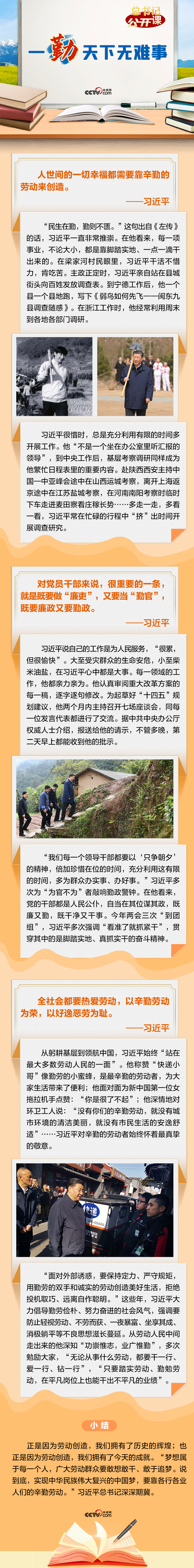習(xí)近平總書記強(qiáng)調(diào),“一勤天下無難事”,“實(shí)現(xiàn)中華民族偉大復(fù)興的中國夢(mèng),要靠各行各業(yè)人們的辛勤勞動(dòng)”?!扒凇笔秦灤┛倳洀恼牡钠焚|(zhì),是對(duì)他夙夜在公、勤勉工作最為凝練的概括。
