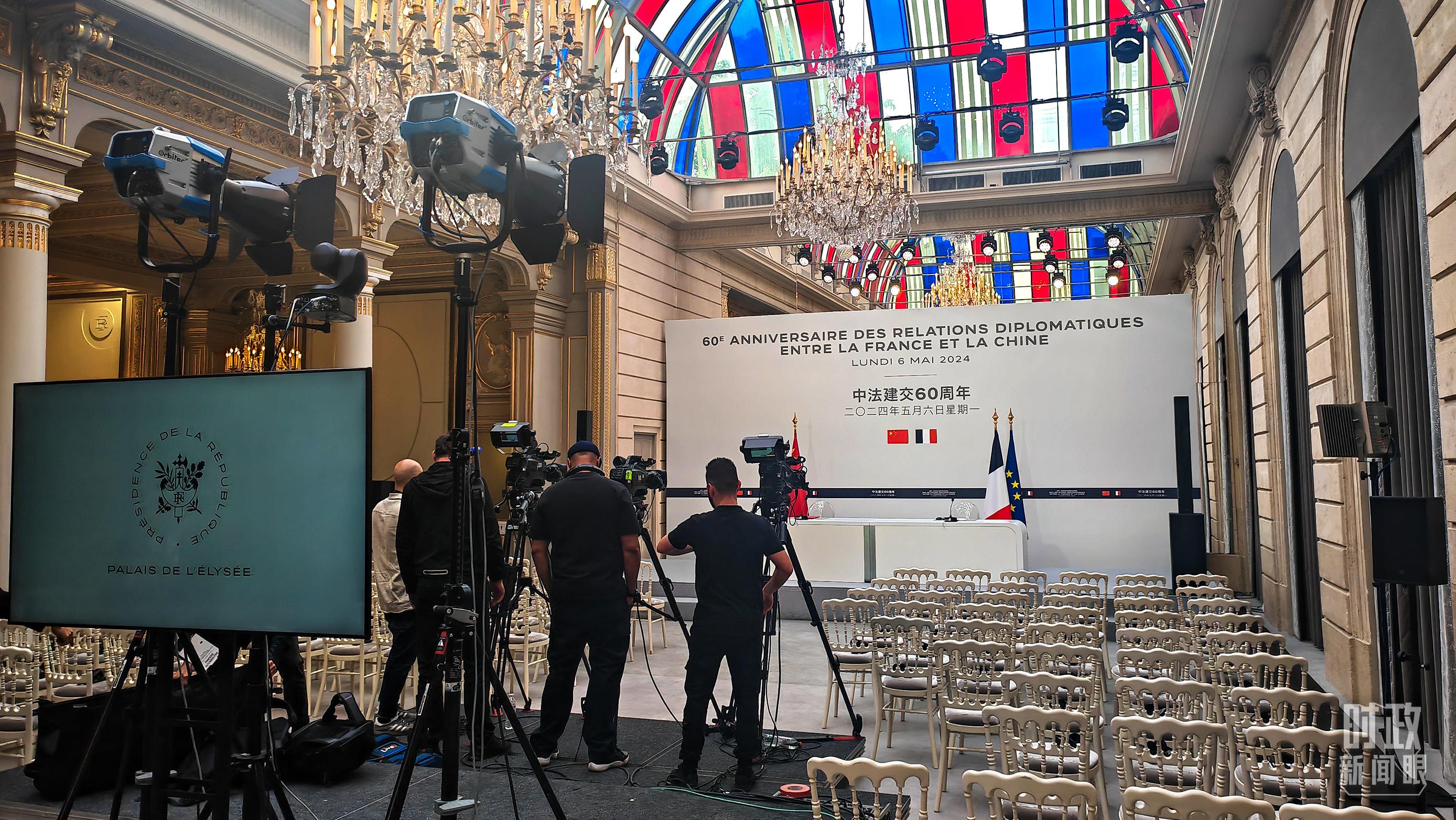習(xí)主席在巴黎愛麗舍宮同馬克龍總統(tǒng)會談后共同會見記者,這是會見開始前的現(xiàn)場。(總臺央廣記者劉會民拍攝)