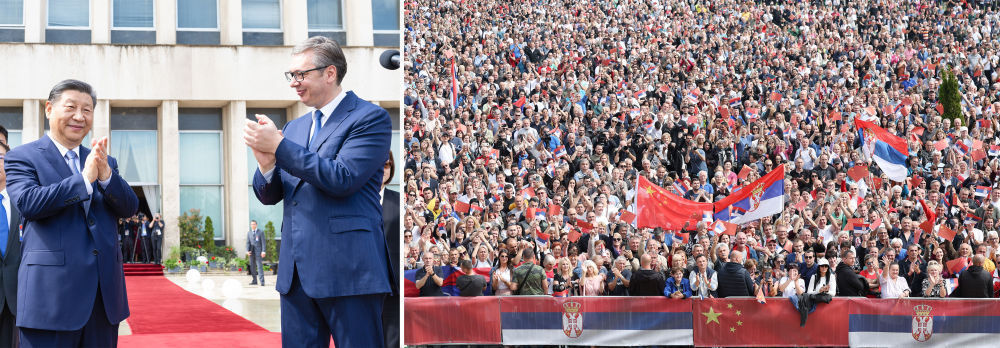 當(dāng)?shù)貢r(shí)間5月8日上午,國(guó)家主席習(xí)近平在貝爾格萊德塞爾維亞大廈同塞爾維亞總統(tǒng)武契奇舉行會(huì)談。會(huì)談前,武契奇陪同習(xí)近平來到政府大廈平臺(tái)(左圖)。大廈廣場(chǎng)上,一萬五千名塞爾維亞民眾揮舞中塞兩國(guó)國(guó)旗,對(duì)習(xí)近平表示最熱烈的歡迎(右圖)。