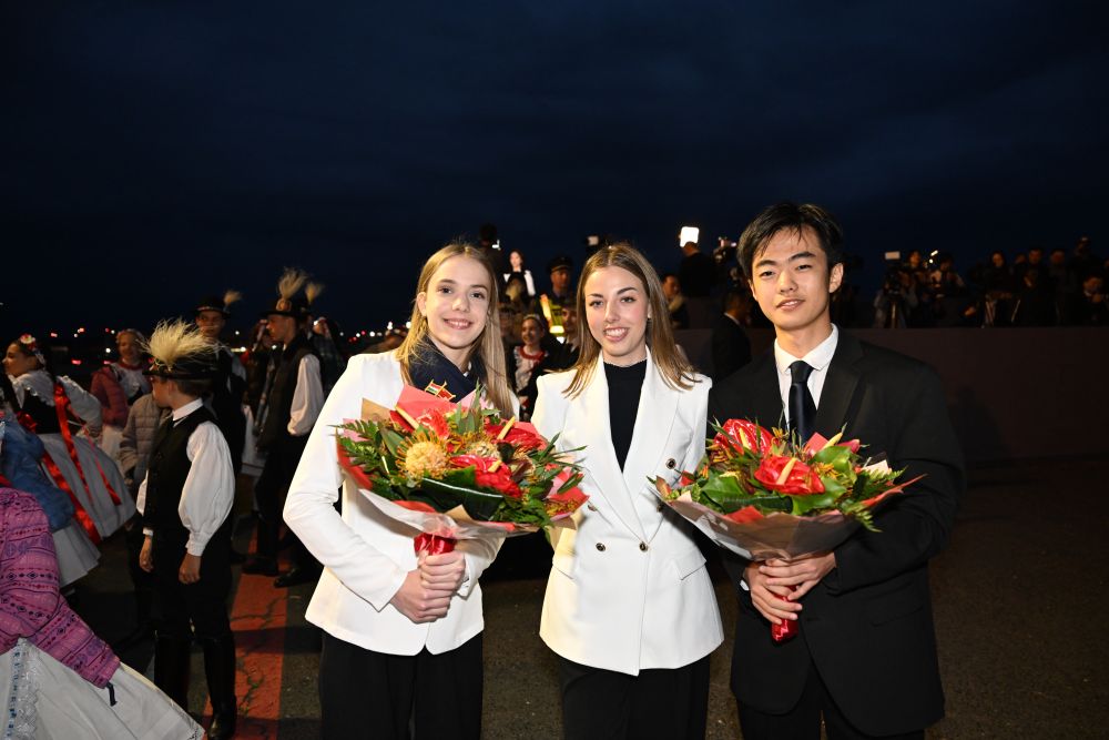 當?shù)貢r間5月8日晚,在匈牙利布達佩斯國際機場,匈牙利姑娘歐拉·塔瑪拉與匈中雙語學(xué)校兩名參加歡迎儀式的學(xué)生合影。新華社記者謝環(huán)馳攝