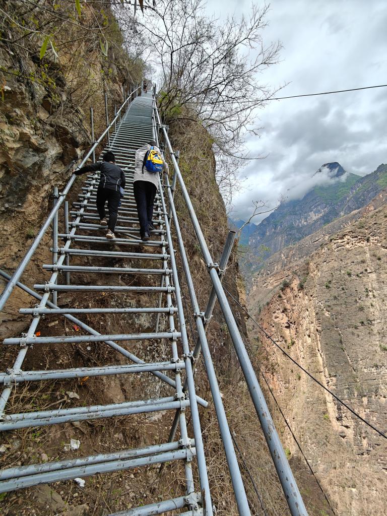 懸崖村因脫貧攻堅而廣受關注,外地許多人自發(fā)到這里攀登鋼梯。鋼梯剛開始倒還平緩,翻上幾個拐彎后,就陡峭起來,而且越來越險。鋼梯之上,一個個身影縮為小點,身子懸空,只敢手腳并用,緊緊拽住鋼梯,向上攀去。