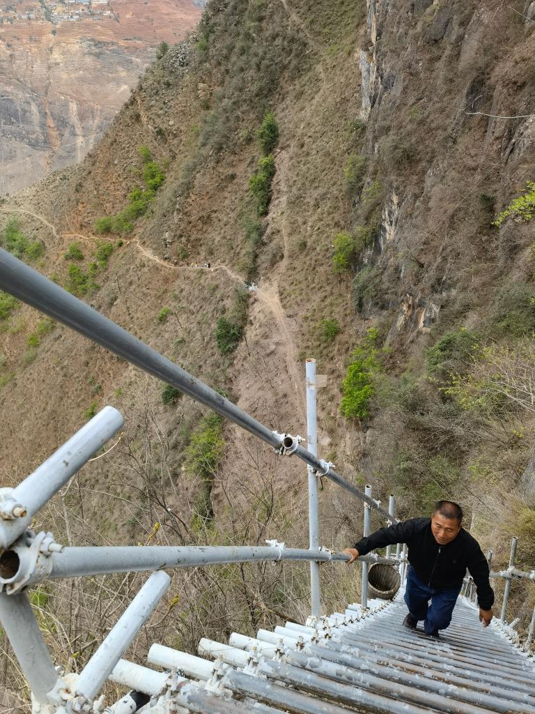 懸崖村鋼梯上正在攀登的人。新華社記者 謝佼 攝