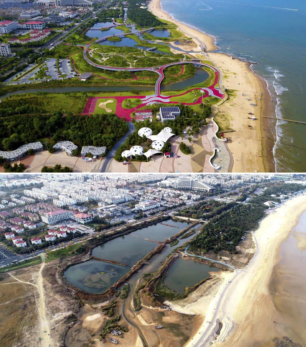 這是一張拼版照片,上圖為2021年拍攝的生態(tài)修復(fù)完成后的山東日照市陽光海岸綠道,該綠道長(zhǎng)28公里(無人機(jī)照片);下圖為2019年11月拍攝的日照市陽光海岸綠道未經(jīng)生態(tài)修復(fù)時(shí)的樣子。新華社記者 郭緒雷 攝