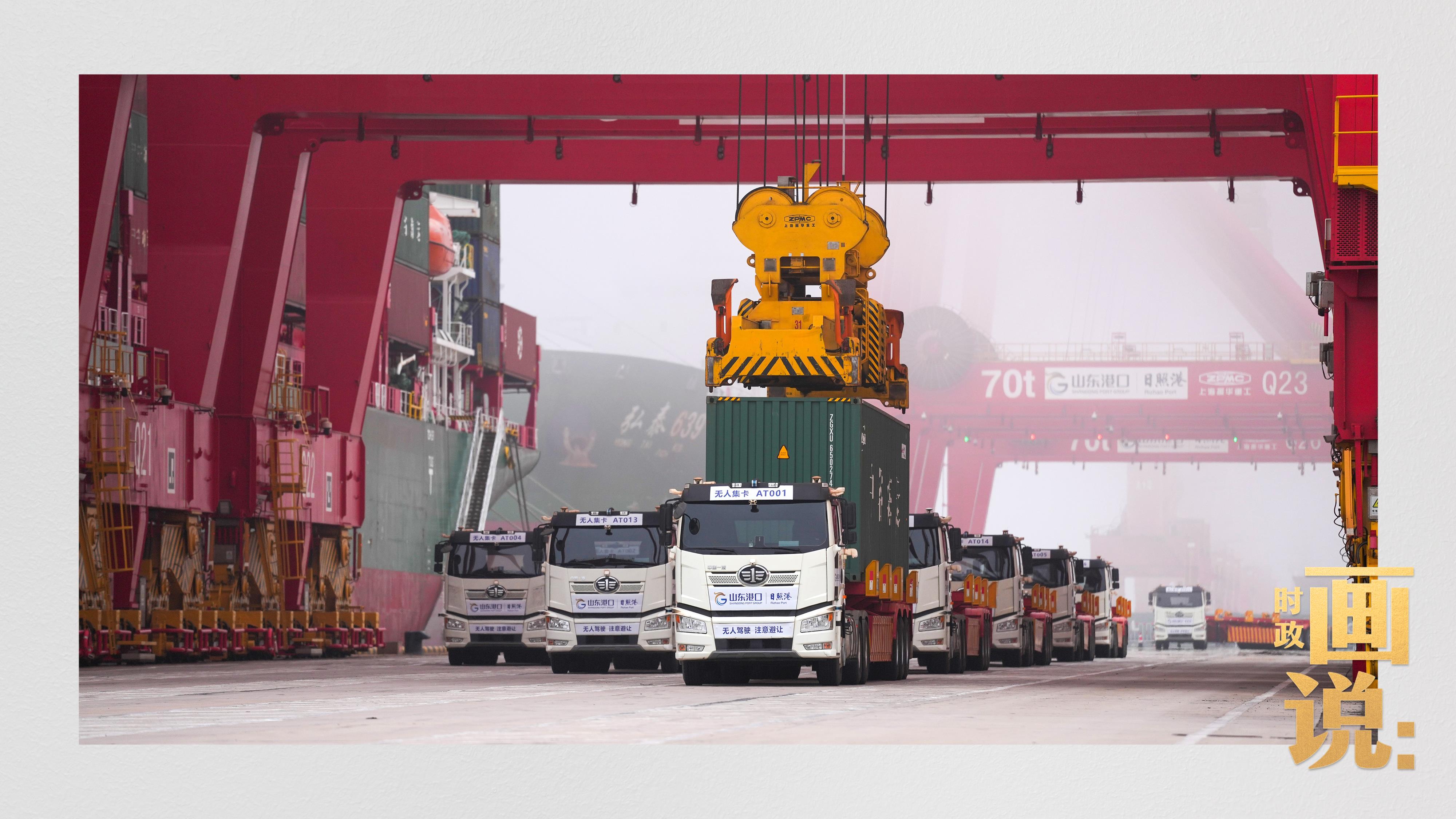 山東港口集團(tuán)日照港順岸開(kāi)放式全自動(dòng)化集裝箱碼頭,無(wú)人集卡車在運(yùn)送集裝箱。