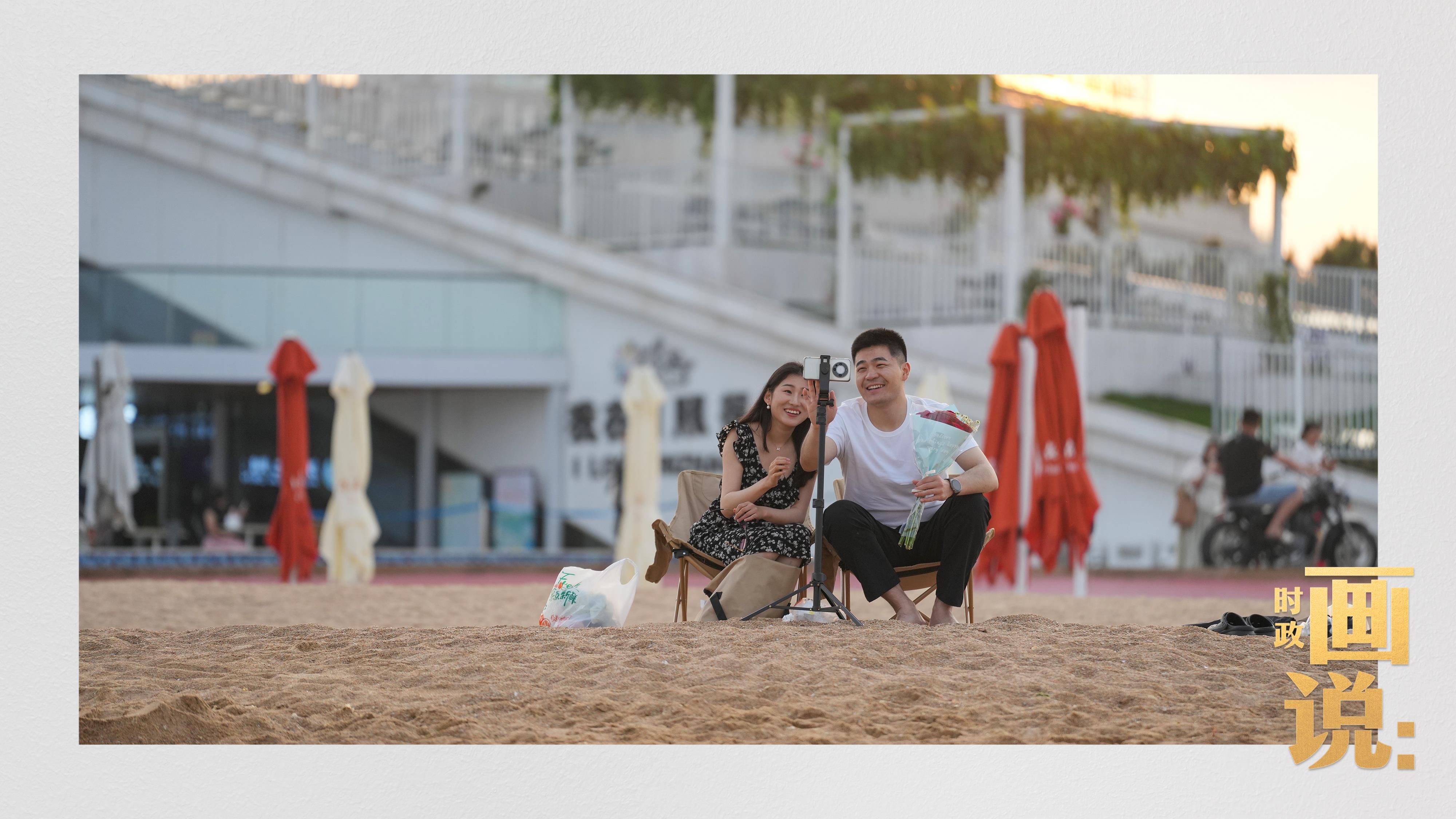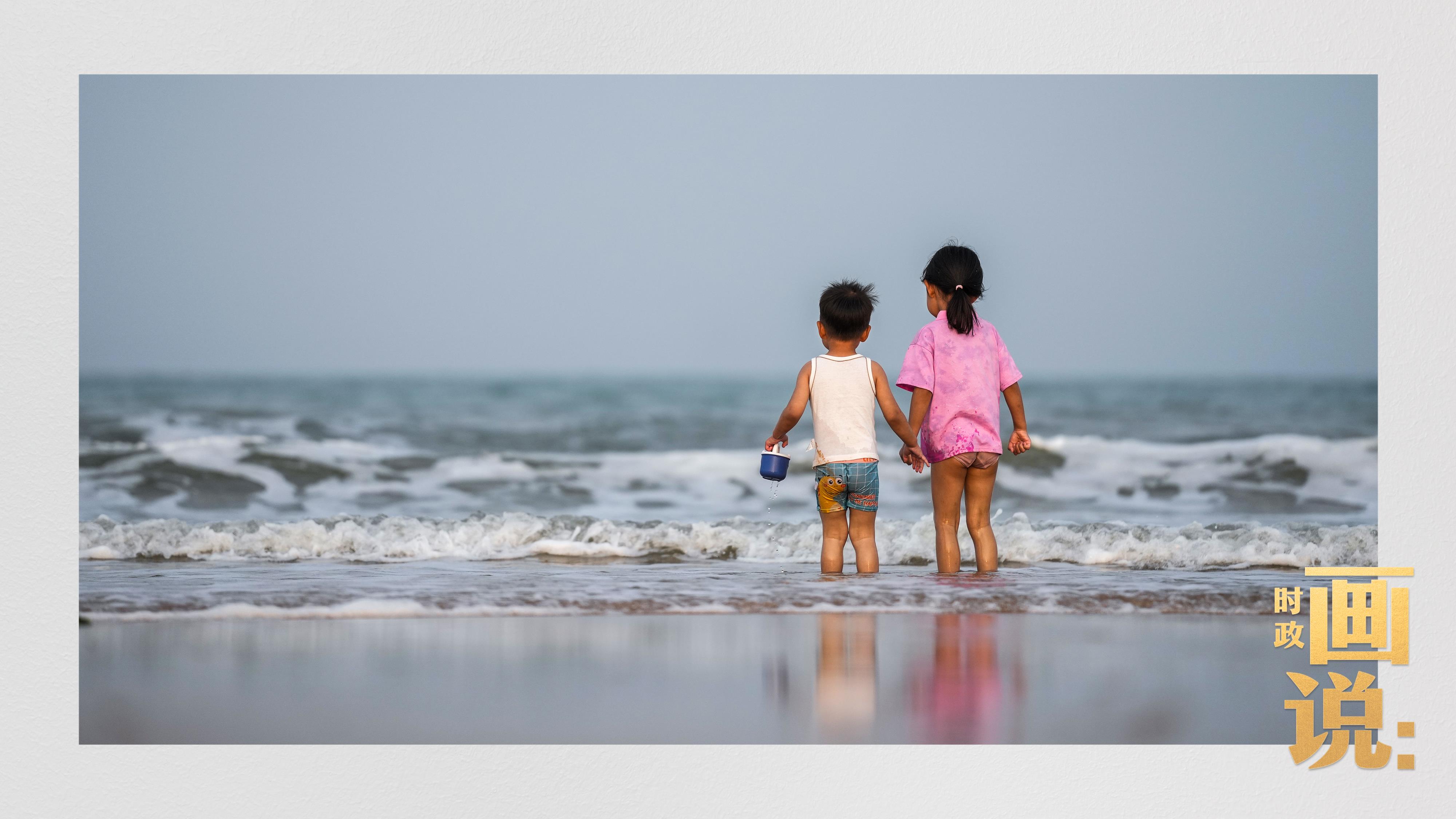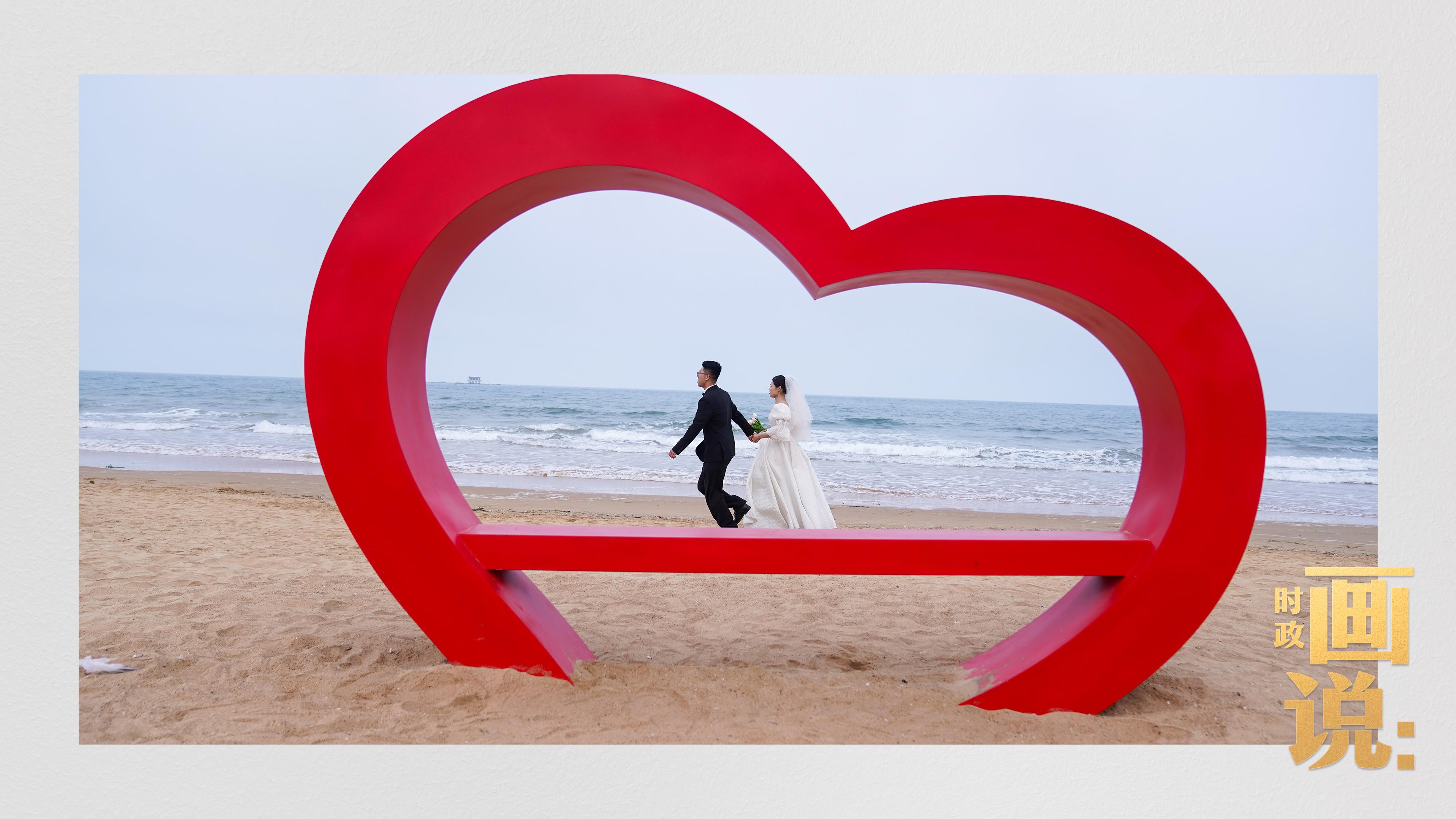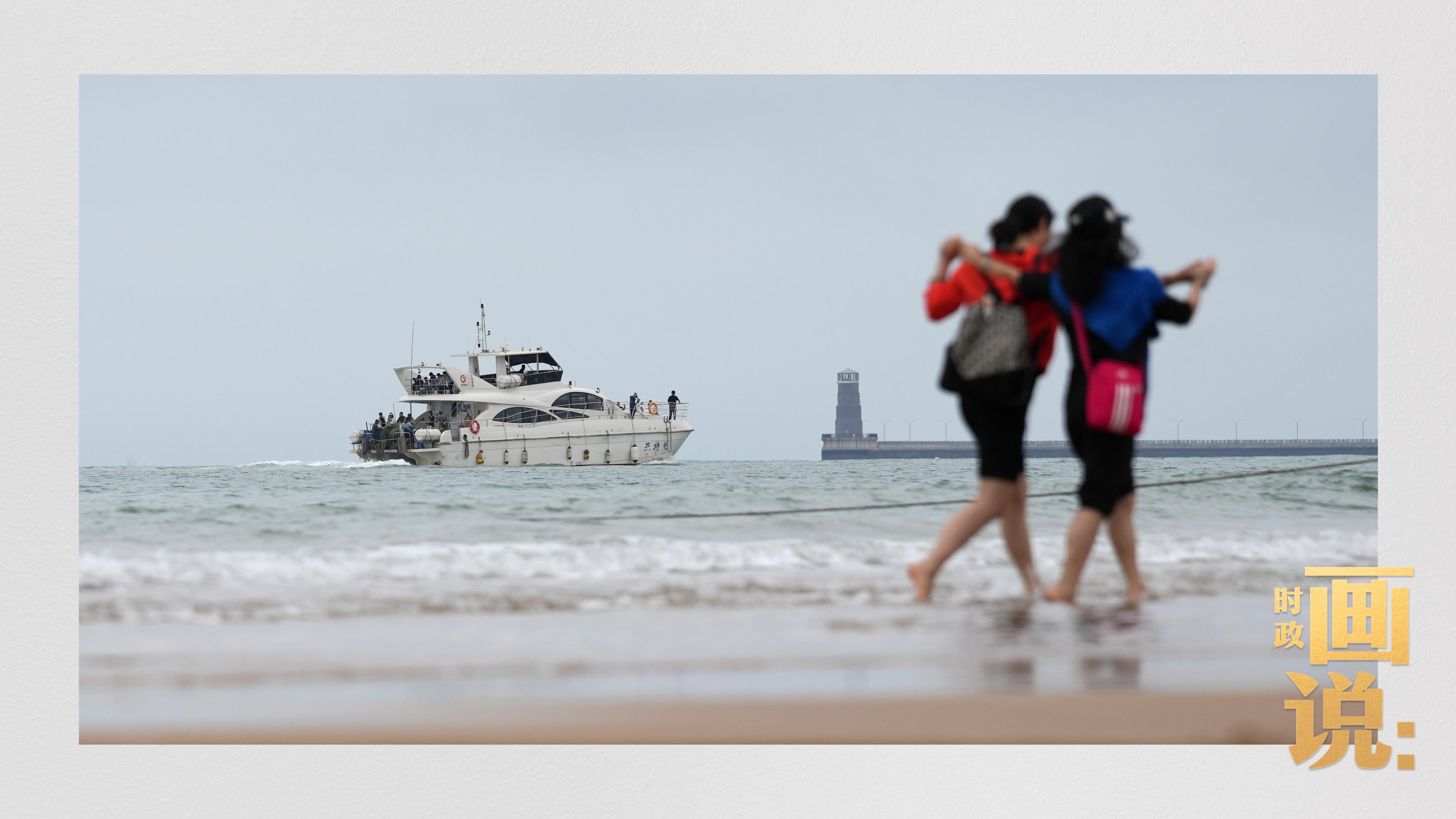 △日照陽(yáng)光海岸綠道上的萬(wàn)平口景區(qū),一對(duì)游客在海浪中翩然起舞。