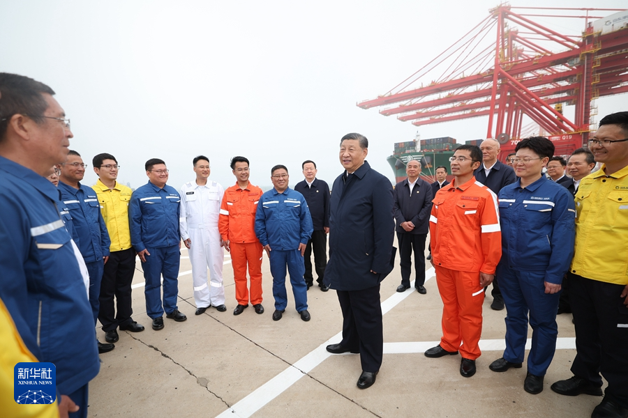 5月22日至24日,中共中央總書記、國家主席、中央軍委主席習近平在山東考察。這是22日下午,習近平在日照港親切慰問港口科技工作者、運營人員、航運人員。新華社記者 鞠鵬 攝