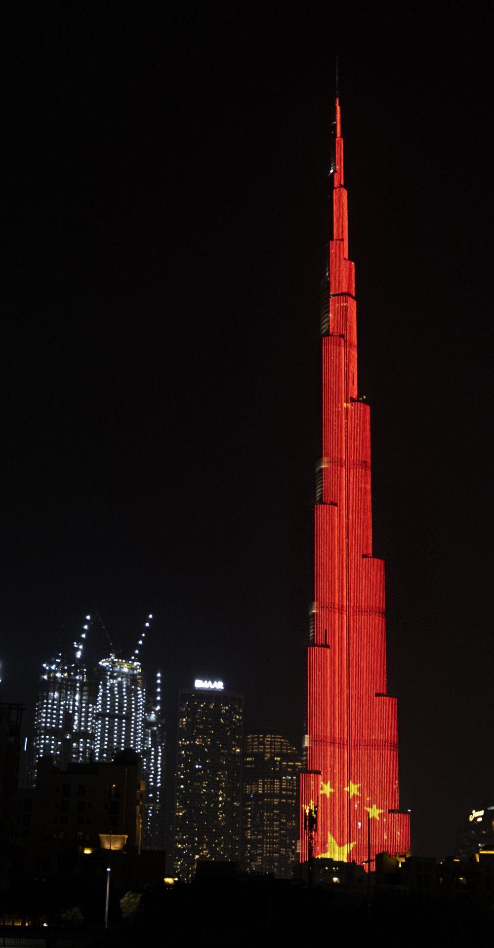 當(dāng)?shù)貢r(shí)間2020年2月2日,在阿聯(lián)酋迪拜,當(dāng)?shù)氐貥?biāo)建筑物哈利法塔點(diǎn)亮中國國旗圖案,為中國抗擊新冠肺炎疫情加油。