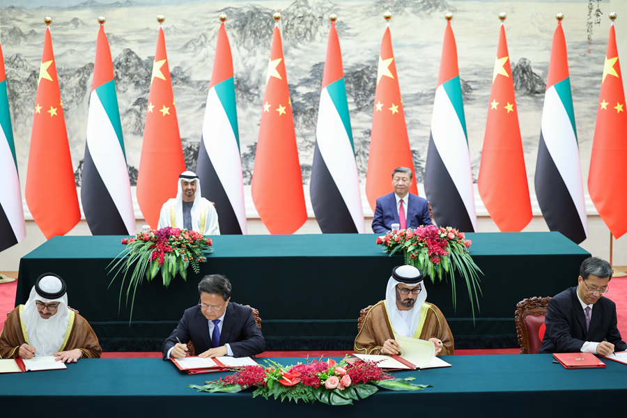 5月30日下午,國家主席習近平在北京人民大會堂同來華國事訪問并出席中國-阿拉伯國家合作論壇第十屆部長級會議開幕式的阿聯(lián)酋總統(tǒng)穆罕默德舉行會談。這是會談后,兩國元首共同見證簽署多項雙邊合作文件。新華社記者 劉彬 攝