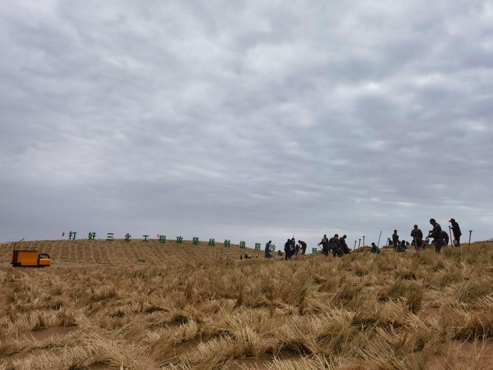 甘肅民勤縣的西大河小井子區(qū)域,草網(wǎng)格狀雙眉式沙障、稻草集束直立式沙障、尼龍網(wǎng)沙障等,間隔多行交錯排列。研究員們逐一測量沙障寬度、高度后,按當?shù)厮Y源等條件,栽下梭梭、毛條、沙拐棗等樹種……
