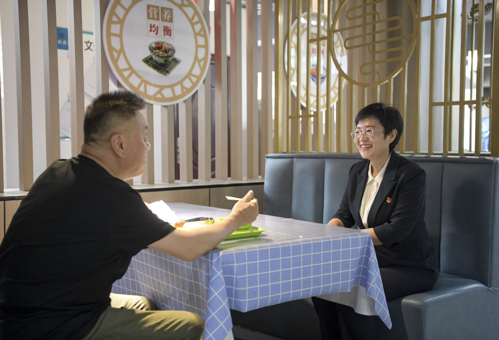 6月20日,寧夏銀川市金鳳區(qū)長城花園社區(qū)黨委書記趙耐香在社區(qū)日間照料中心了解食堂運(yùn)行情況。