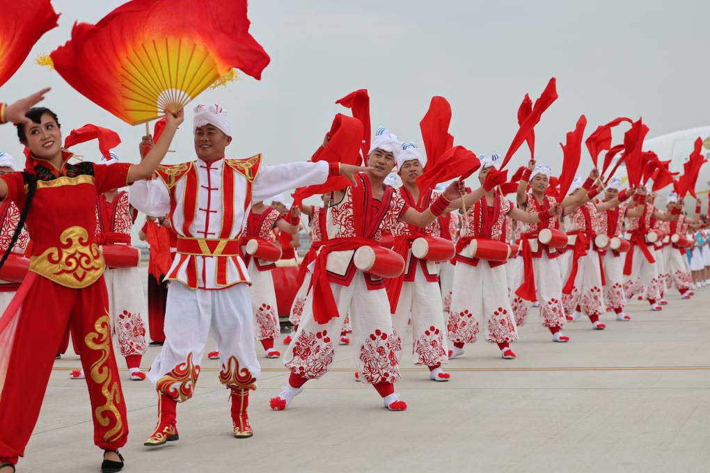 2023年5月17日下午,出席中國-中亞峰會(huì)的哈薩克斯坦總統(tǒng)托卡耶夫抵達(dá)陜西省西安市。當(dāng)?shù)孛癖娨詿崆榈难?、歡快的秧歌等民間藝術(shù)表演歡迎貴賓到來。新華社記者 邢廣利 攝