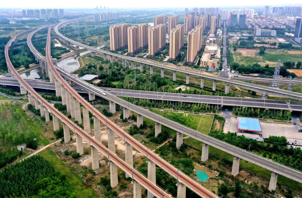 2024年5月30日,一列動(dòng)車(chē)組列車(chē)行駛在鄭州東站附近的線(xiàn)路上。(新華社發(fā))