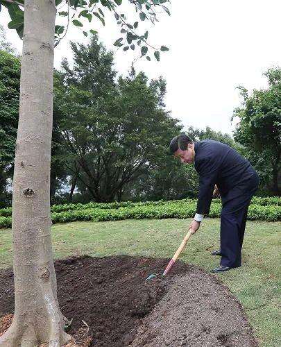 8年前種下的那棵高山榕已是亭亭如蓋、枝繁葉茂,展現(xiàn)出蓬勃的生命活力??倳涀叩綐湎?,深有感慨地說:“8年了,彈指一揮間啊。選的這個地方很好,樹冠能展開,樹長得也快?!?/p>