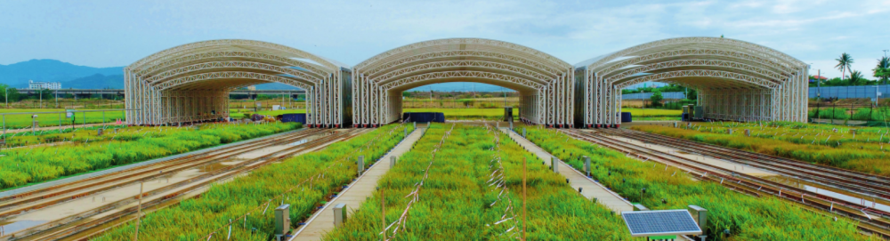 在位于三亞的國家耐鹽堿水稻技術(shù)創(chuàng)新中心崖州灣總部科研試驗(yàn)基地,建設(shè)了高標(biāo)準(zhǔn)試驗(yàn)田、鹽(堿)性精準(zhǔn)鑒定鹽池、自動防雨鋼棚、水土鹽堿度智能化監(jiān)測系統(tǒng)等配套設(shè)施(2024年5月17日攝)。黎多江攝/本刊