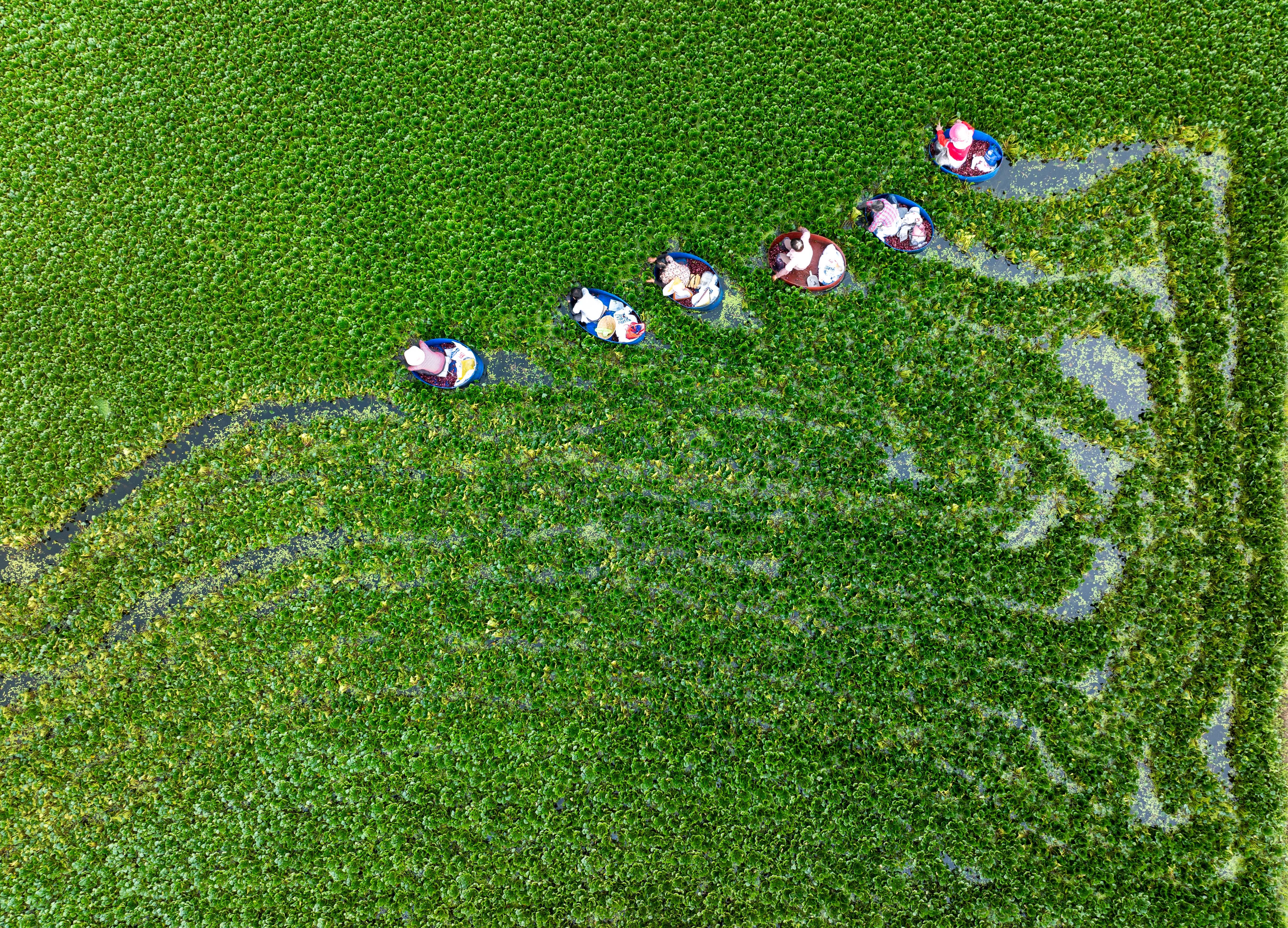 2024年8月7日,江蘇淮安市洪澤區(qū)岔河鎮(zhèn)的村民采收菱角。近年來,當?shù)乩冒遵R湖優(yōu)質(zhì)水域生態(tài)為依托,帶動當?shù)剞r(nóng)民增收致富,助力鄉(xiāng)村振興。