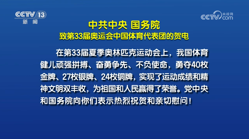 8月11日,中共中央、國務(wù)院向第33屆夏季奧運會中國體育代表團致賀電,高度評價我國體育健兒“實現(xiàn)了運動成績和精神文明雙豐收,為祖國和人民贏得了榮譽”。賀電指出,我國體育健兒們以優(yōu)異成績和出色表現(xiàn),進一步激發(fā)了海內(nèi)外中華兒女的愛國熱情、振奮了民族精神、凝聚了奮進力量。
