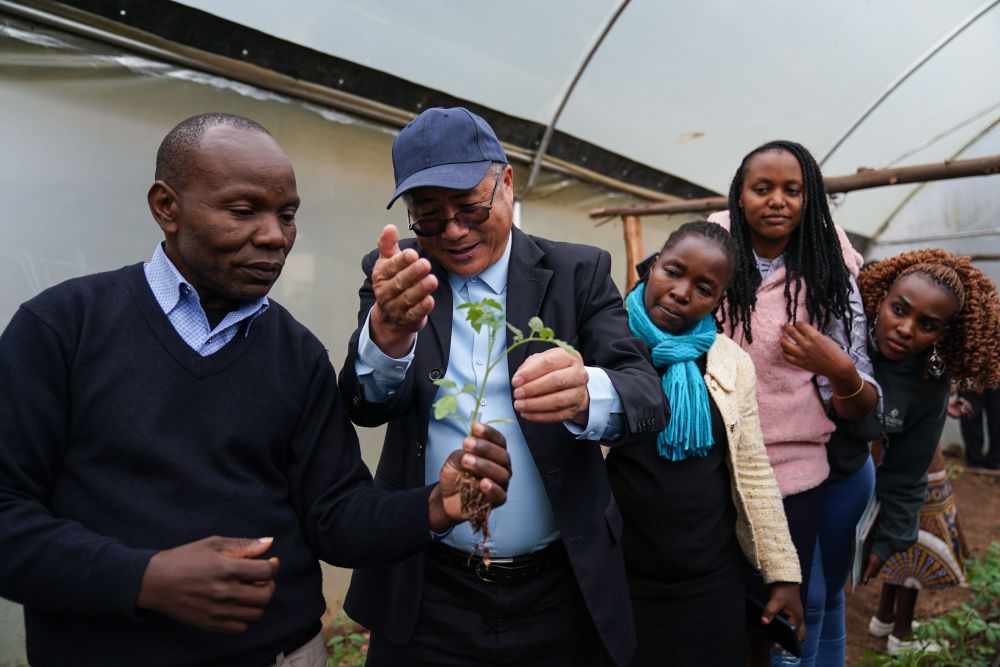 2023年9月18日,在肯尼亞納庫(kù)魯郡舉辦的中非農(nóng)業(yè)發(fā)展和減貧示范村番茄生產(chǎn)培訓(xùn)班上,來(lái)自中國(guó)的農(nóng)學(xué)教授劉高瓊(左二)為肯方學(xué)員指導(dǎo)農(nóng)業(yè)技術(shù)。多年來(lái),中國(guó)農(nóng)業(yè)專(zhuān)家在當(dāng)?shù)亻_(kāi)展了知識(shí)培訓(xùn)、技術(shù)指導(dǎo)和農(nóng)業(yè)設(shè)施修繕等工作,有效助力中國(guó)先進(jìn)的農(nóng)業(yè)技術(shù)在納庫(kù)魯?shù)貐^(qū)的示范推廣,幫助農(nóng)民實(shí)現(xiàn)增收減貧的目標(biāo)。