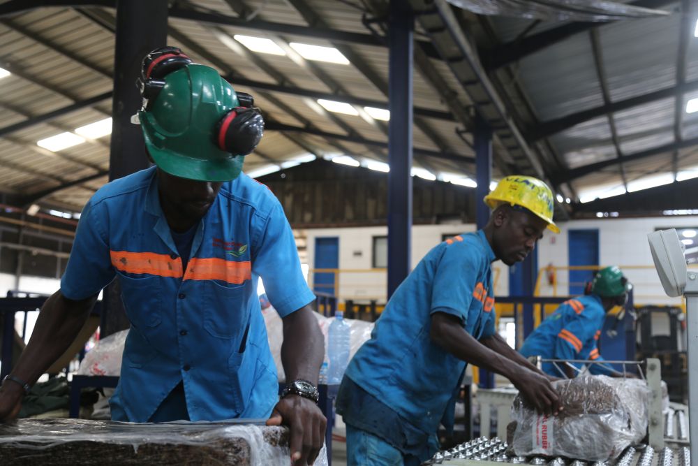 2024年6月10日,在科特迪瓦南部城鎮(zhèn)達(dá)布郊區(qū),工人們?cè)诿捞m橡膠加工廠對(duì)成品橡膠進(jìn)行打包。中國(guó)加工廠幫助科特迪瓦橡膠增加產(chǎn)品附加值,提高膠農(nóng)收入。