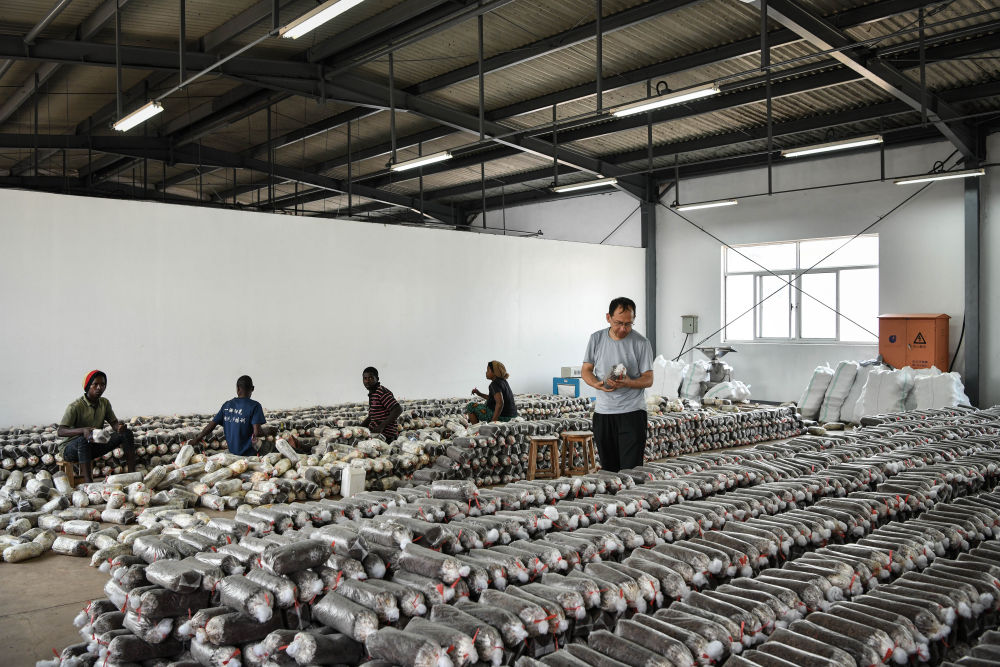2024年8月13日,在盧旺達(dá)南方省胡耶區(qū)的中國(guó)援盧農(nóng)業(yè)技術(shù)示范中心,菌草專(zhuān)家陳曉斌(右)檢查菌袋。自菌草技術(shù)引入盧旺達(dá)以來(lái),當(dāng)?shù)鼐莓a(chǎn)業(yè)發(fā)展迅速,不僅為市場(chǎng)提供了豐富的食用菌產(chǎn)品,還創(chuàng)造了大量就業(yè)機(jī)會(huì)。