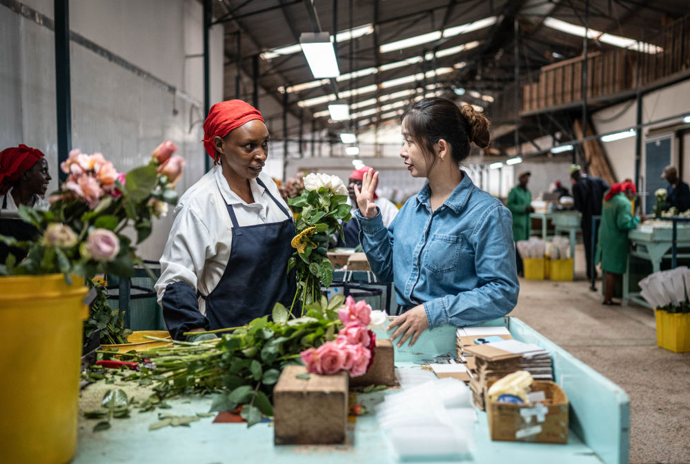 2024年5月18日,湖南璽悅國(guó)際貿(mào)易有限公司負(fù)責(zé)人黃梓楠(右)在肯尼亞納紐基的坦布濟(jì)花卉農(nóng)場(chǎng)挑選鮮花。中國(guó)政府2021年11月宣布為非洲農(nóng)產(chǎn)品輸華建立“綠色通道”,縮短檢驗(yàn)檢疫時(shí)間,擴(kuò)大關(guān)稅豁免,為肯尼亞鮮花及非洲各國(guó)的牛油果、柑橘、菠蘿等特色農(nóng)產(chǎn)品打開(kāi)了銷(xiāo)路。