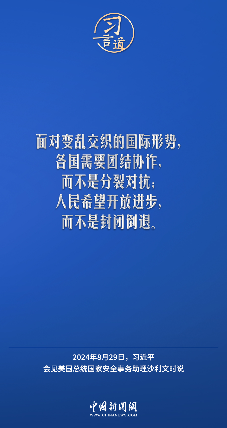 8月29日,國家主席習(xí)近平在北京人民大會(huì)堂會(huì)見美國總統(tǒng)國家安全事務(wù)助理沙利文。習(xí)近平指出——