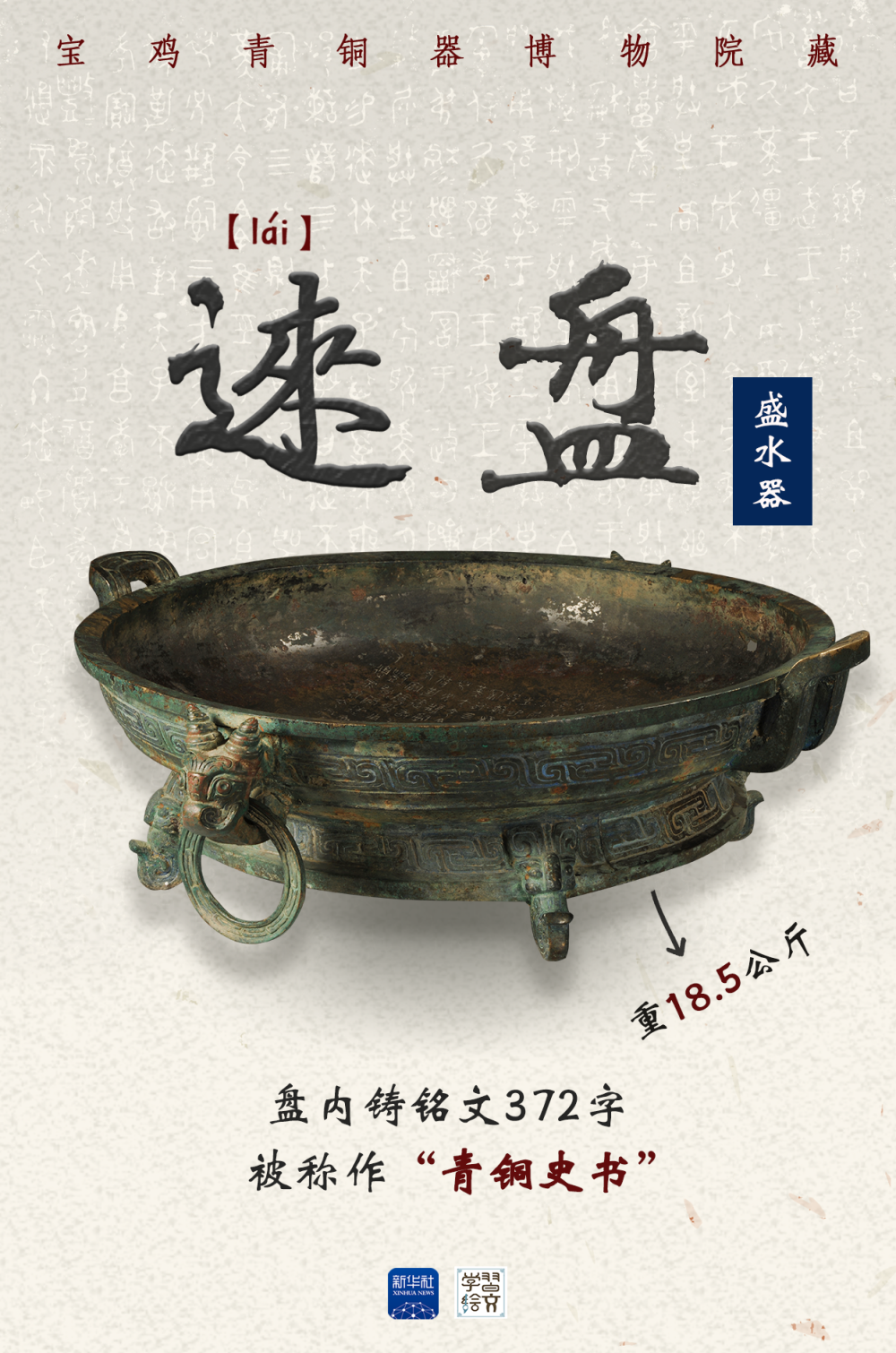 這件青銅器是被稱(chēng)作“青銅史書(shū)”的逨盤(pán)。盤(pán)內(nèi)鑄銘文372字,完整記錄了單氏家族八代人輔佐西周12位周王征戰(zhàn)、理政、管治林澤的重要史事。從銘文中可看出,周人將家族命運(yùn)和國(guó)家命運(yùn)緊密結(jié)合,也是后來(lái)儒家“修身、齊家、治國(guó)、平天下”的思想基礎(chǔ)。