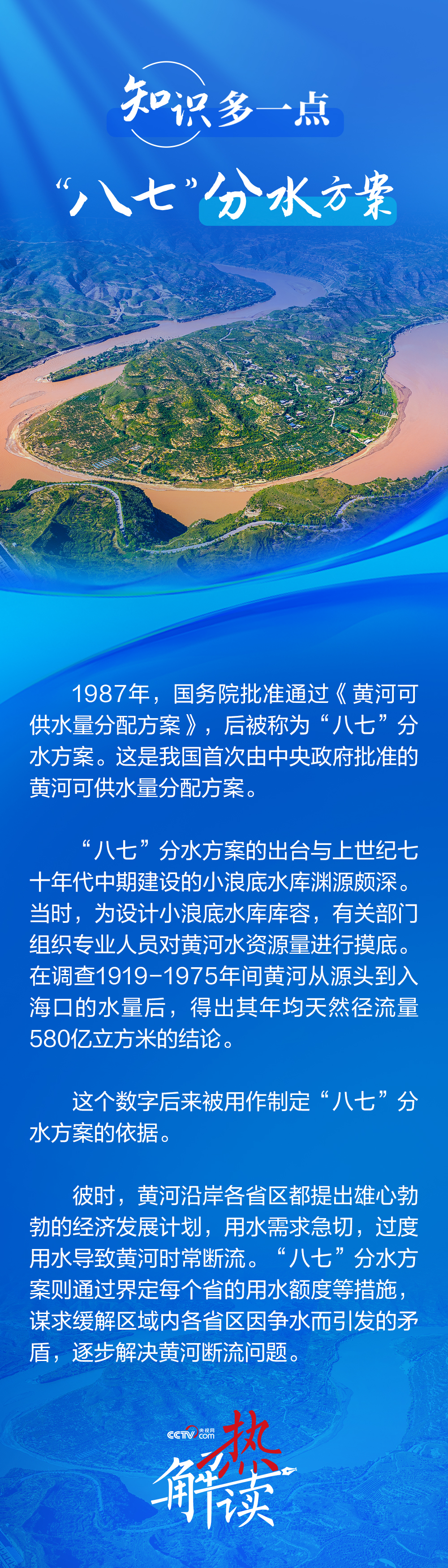 “八七”分水方案是上世紀(jì)八十年代我國批準(zhǔn)的黃河可供水量分配方案。該方案以1980年實(shí)際用水量為基準(zhǔn),綜合考慮了沿黃各省區(qū)的灌溉發(fā)展規(guī)模、工業(yè)和城市用水增長以及大中型水利工程興建等因素,來為沿黃各省區(qū)分配黃河用水權(quán)。“八七”分水方案自1987年國務(wù)院批復(fù)后沿用至今,未重新調(diào)整。