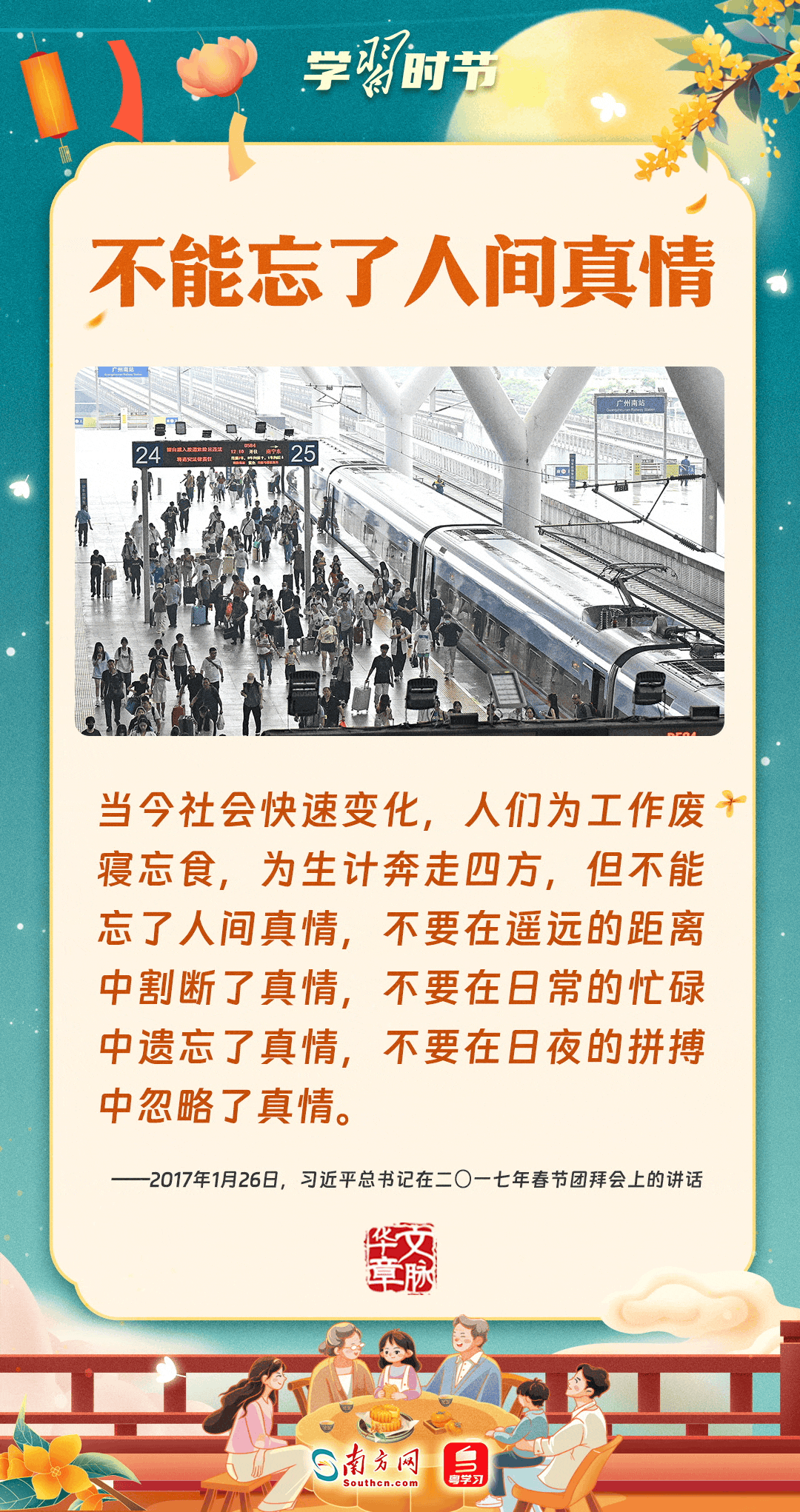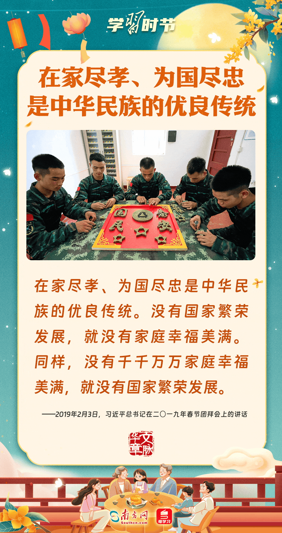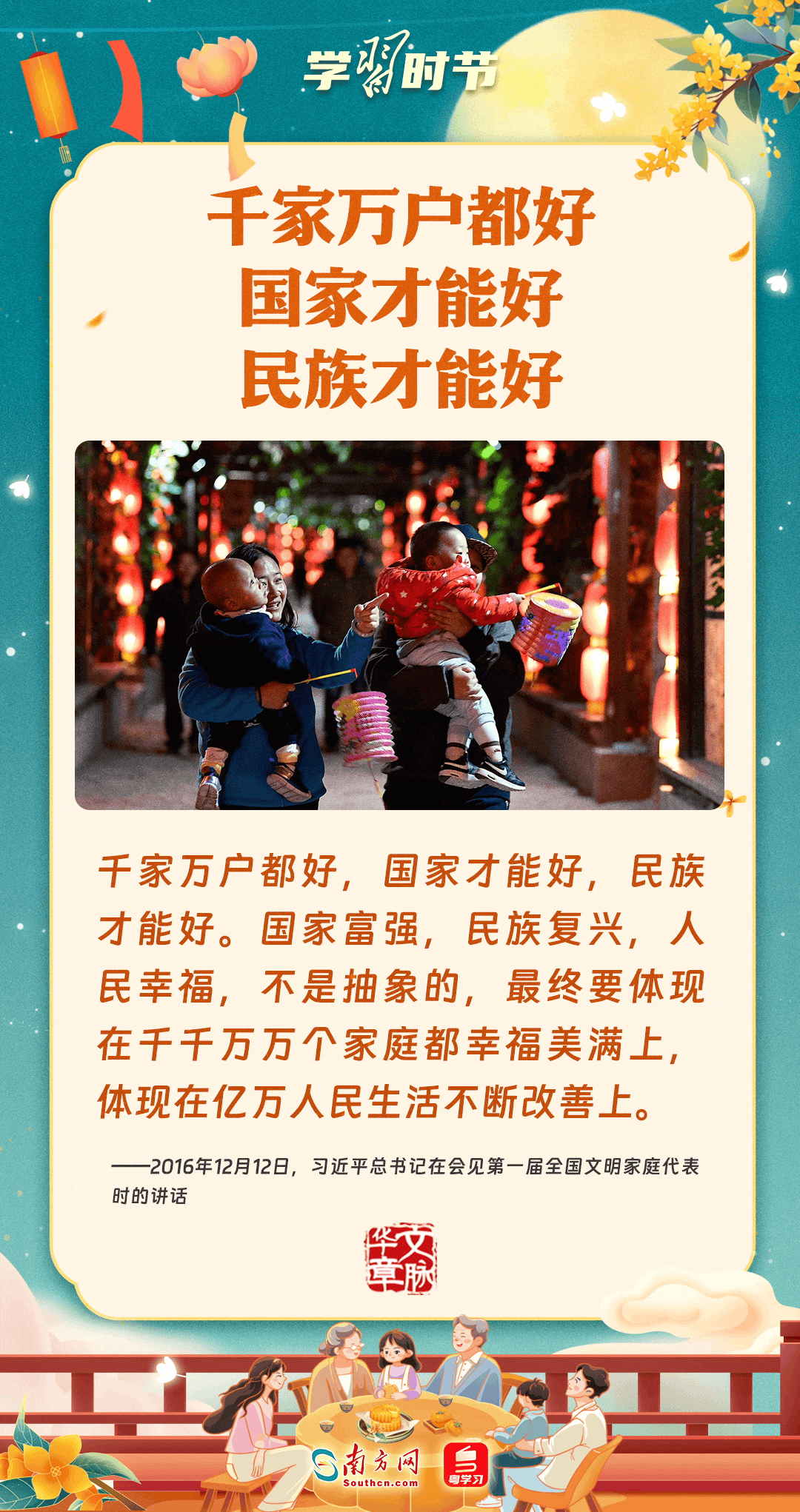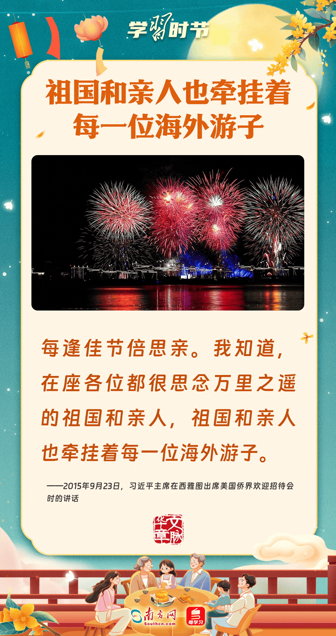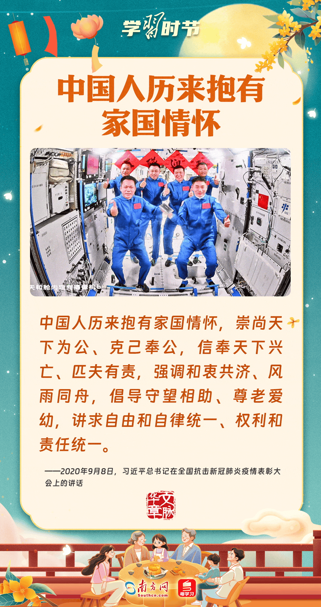 明月寄相思,家國總關(guān)情。作為中華優(yōu)秀傳統(tǒng)文化的重要載體之一,中秋節(jié)不但寄托著海內(nèi)外華人對(duì)闔家團(tuán)圓的美好期許,還承載著深厚的故鄉(xiāng)情、家國情。習(xí)近平總書記曾在多個(gè)場合深刻闡述個(gè)人、家庭與國家之間的關(guān)系,強(qiáng)調(diào)要厚植家國情懷,把實(shí)現(xiàn)個(gè)人夢、家庭夢融入國家夢、民族夢之中。中秋佳節(jié),讓我們一起回顧總書記那些經(jīng)典話語,共同感受他至深至厚的家國情懷。