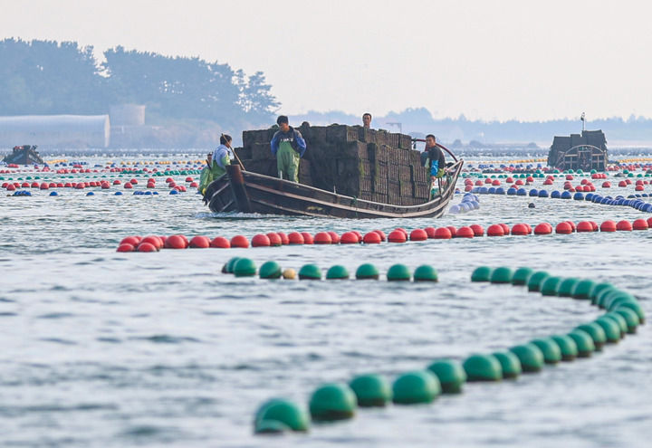 在山東省榮成市愛(ài)倫灣海域,鮑魚(yú)養(yǎng)殖戶(hù)駕駛滿載鮑魚(yú)的漁船返回(2024年9月11日攝)。新華社發(fā)(李信君攝)