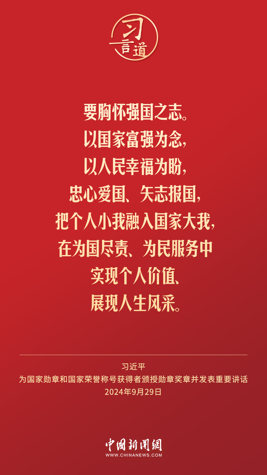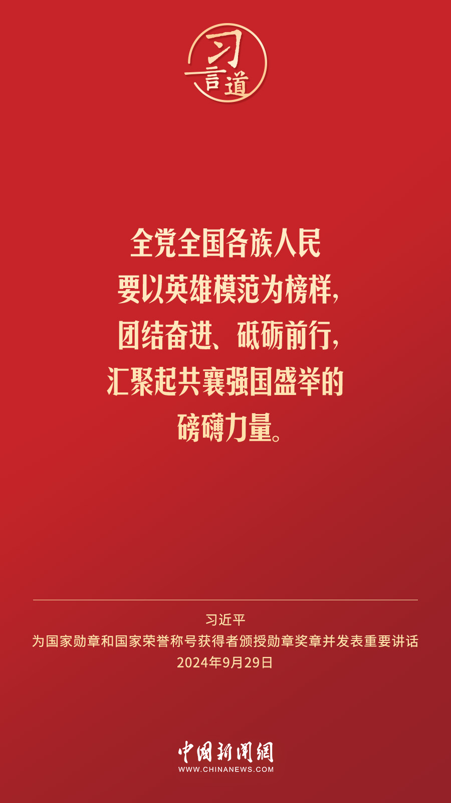 經(jīng)中共中央批準,中華人民共和國國家勛章和國家榮譽稱號頒授儀式于9月29日上午10時在人民大會堂隆重舉行。中共中央總書記、國家主席、中央軍委主席習近平向國家勛章和國家榮譽稱號獲得者分別授予“共和國勛章”“友誼勛章”和國家榮譽稱號獎?wù)虏l(fā)表重要講話。習近平指出——