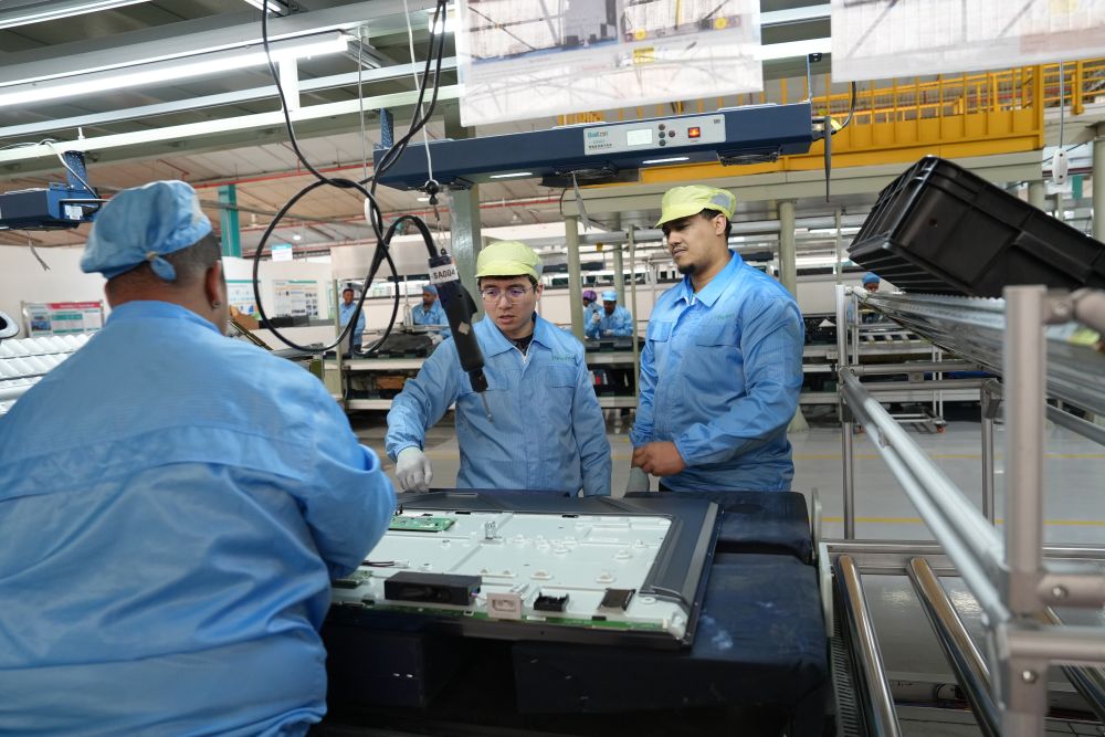 2024年8月14日,中方工程師(中)在南非開普敦的海信南非工業(yè)園電視機生產(chǎn)線上指導當?shù)貑T工工作。工業(yè)園已為當?shù)貏?chuàng)造1000多個直接就業(yè)機會、5000多個間接就業(yè)崗位,帶動地區(qū)產(chǎn)業(yè)鏈發(fā)展。