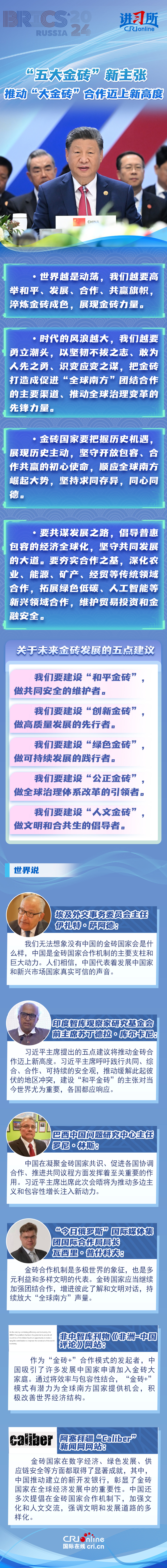 “時(shí)代的風(fēng)浪越大,我們越要勇立潮頭,以堅(jiān)韌不拔之志、敢為人先之勇、識變應(yīng)變之謀,把金磚打造成促進(jìn)‘全球南方’團(tuán)結(jié)合作的主要渠道、推動(dòng)全球治理變革的先鋒力量。”當(dāng)?shù)貢r(shí)間10月23日,習(xí)近平主席在俄羅斯喀山出席金磚國家領(lǐng)導(dǎo)人第十六次會(huì)晤并發(fā)表重要講話,提出共建“和平金磚”“創(chuàng)新金磚”“綠色金磚”“公正金磚”“人文金磚”,為“大金磚合作”擘畫藍(lán)圖。