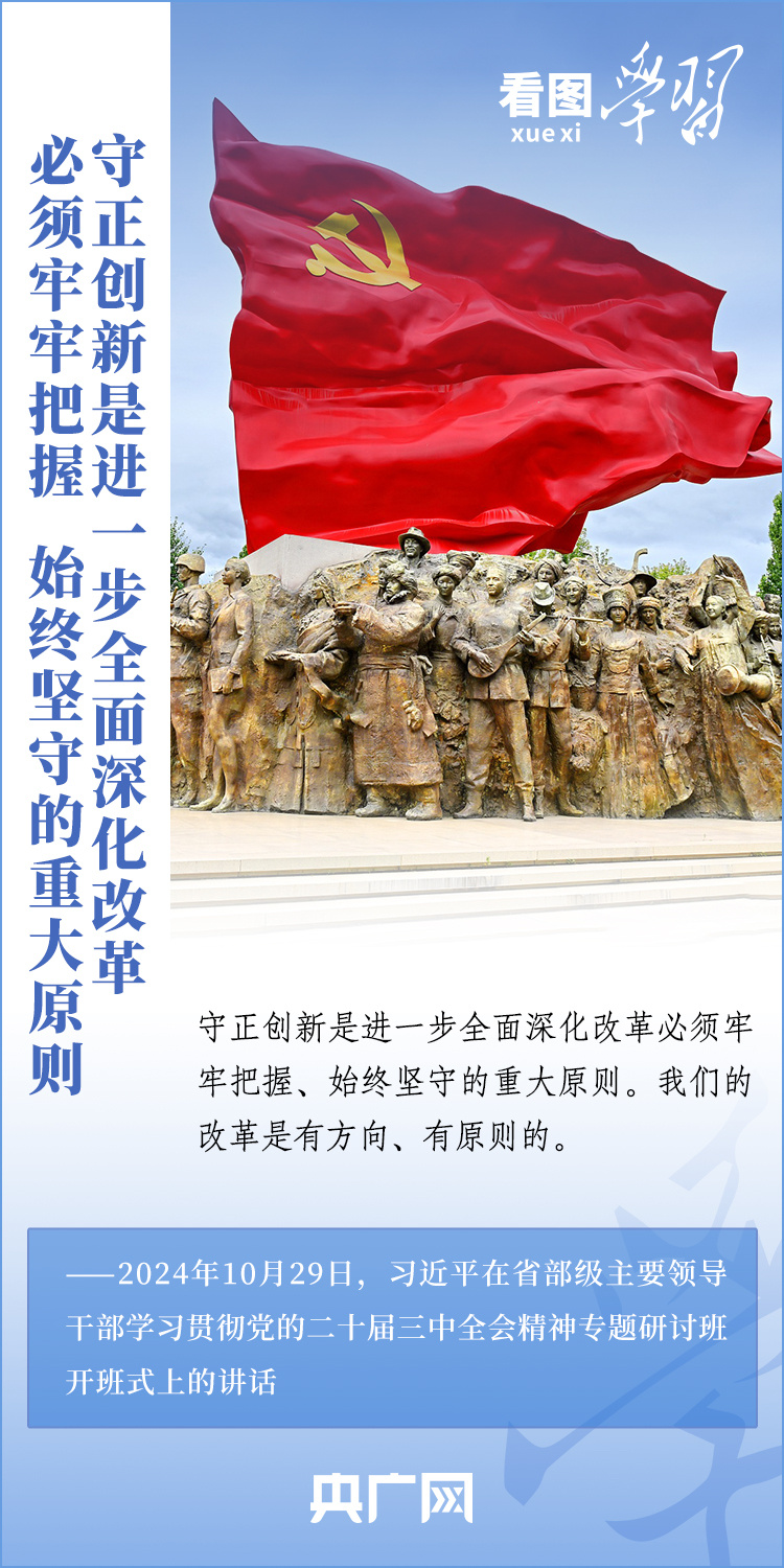 改革只有進(jìn)行時(shí),沒有完成時(shí)。10月29日,省部級(jí)主要領(lǐng)導(dǎo)干部學(xué)習(xí)貫徹黨的二十屆三中全會(huì)精神專題研討班在中央黨校(國家行政學(xué)院)開班。習(xí)近平總書記發(fā)表重要講話,就進(jìn)一步全面深化改革的一系列重大問題進(jìn)行深刻闡釋,強(qiáng)調(diào)要牢牢把握、始終堅(jiān)守“守正創(chuàng)新”這一重大原則,把握好“四對關(guān)系”,奮力打開改革發(fā)展新天地。一起來學(xué)習(xí)!