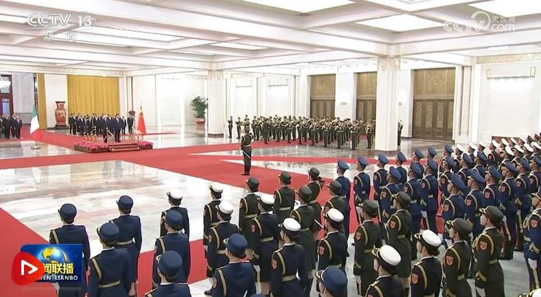 天安門廣場(chǎng)鳴放21響禮炮,禮兵列隊(duì)致敬。兩國元首登上檢閱臺(tái),軍樂團(tuán)奏中意兩國國歌。馬塔雷拉在習(xí)近平陪同下檢閱中國人民解放軍儀仗隊(duì),并觀看分列式。