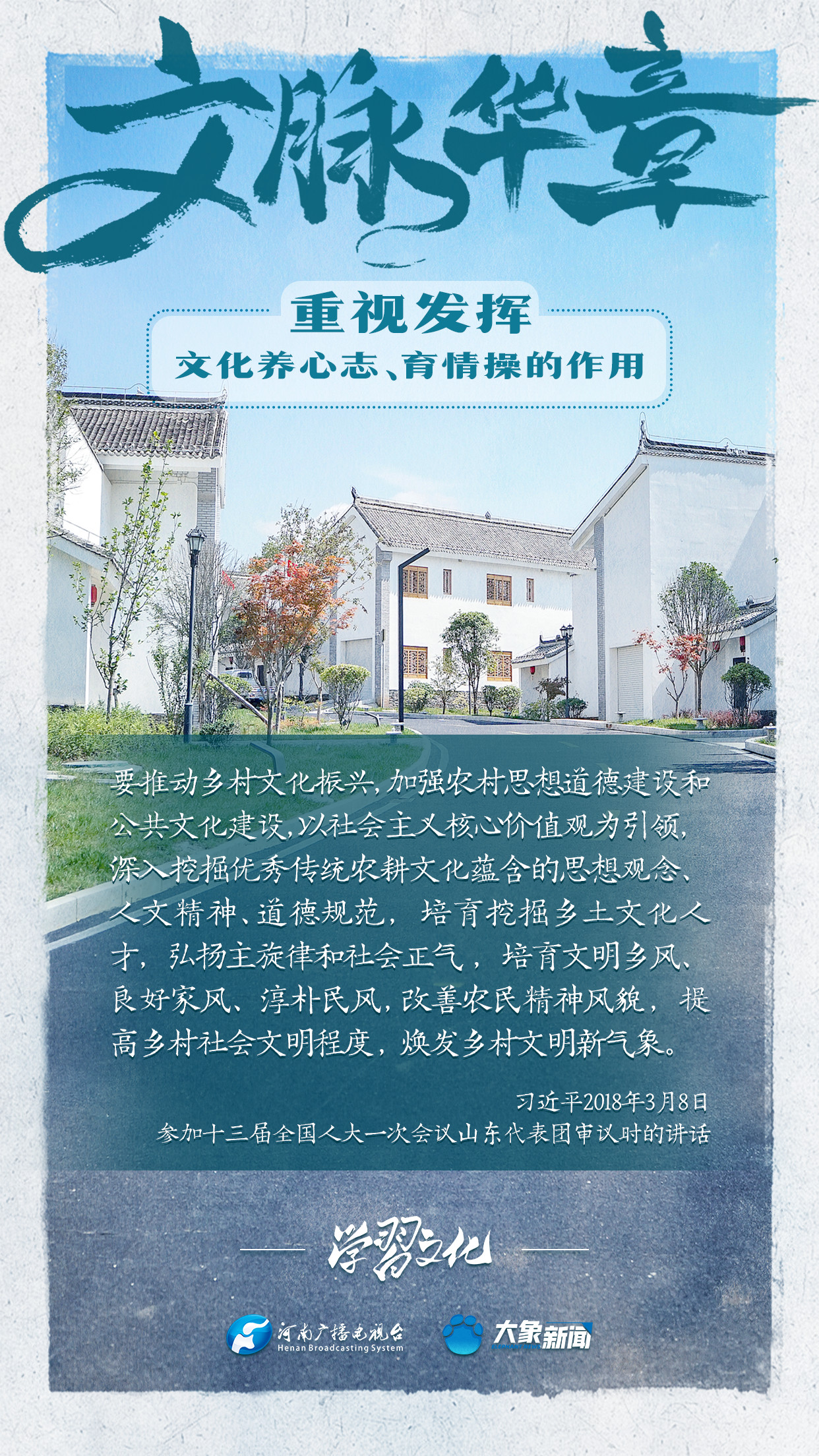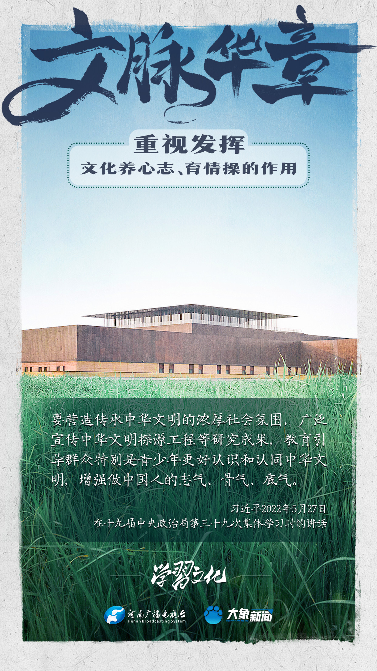 習(xí)近平總書記在主持中共中央政治局第十七次集體學(xué)習(xí)時(shí)強(qiáng)調(diào),重視發(fā)揮文化養(yǎng)心志、育情操的作用,涵養(yǎng)全民族昂揚(yáng)奮發(fā)的精神氣質(zhì)??倳浉叨戎匾曃幕淖饔?,發(fā)表了一系列重要講話,倡導(dǎo)以文載道、以文傳聲、以文化人。我們一起學(xué)習(xí)。