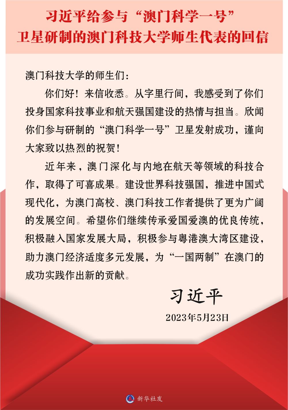 參與衛(wèi)星研制的澳門科技大學(xué)18名師生代表給習(xí)近平主席寫信,匯報衛(wèi)星成功發(fā)射的喜訊和參與衛(wèi)星研制工作的感受。5月23日,習(xí)近平主席給參與“澳科一號”衛(wèi)星研制的師生代表回信,對他們予以親切勉勵。