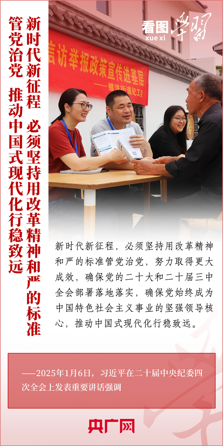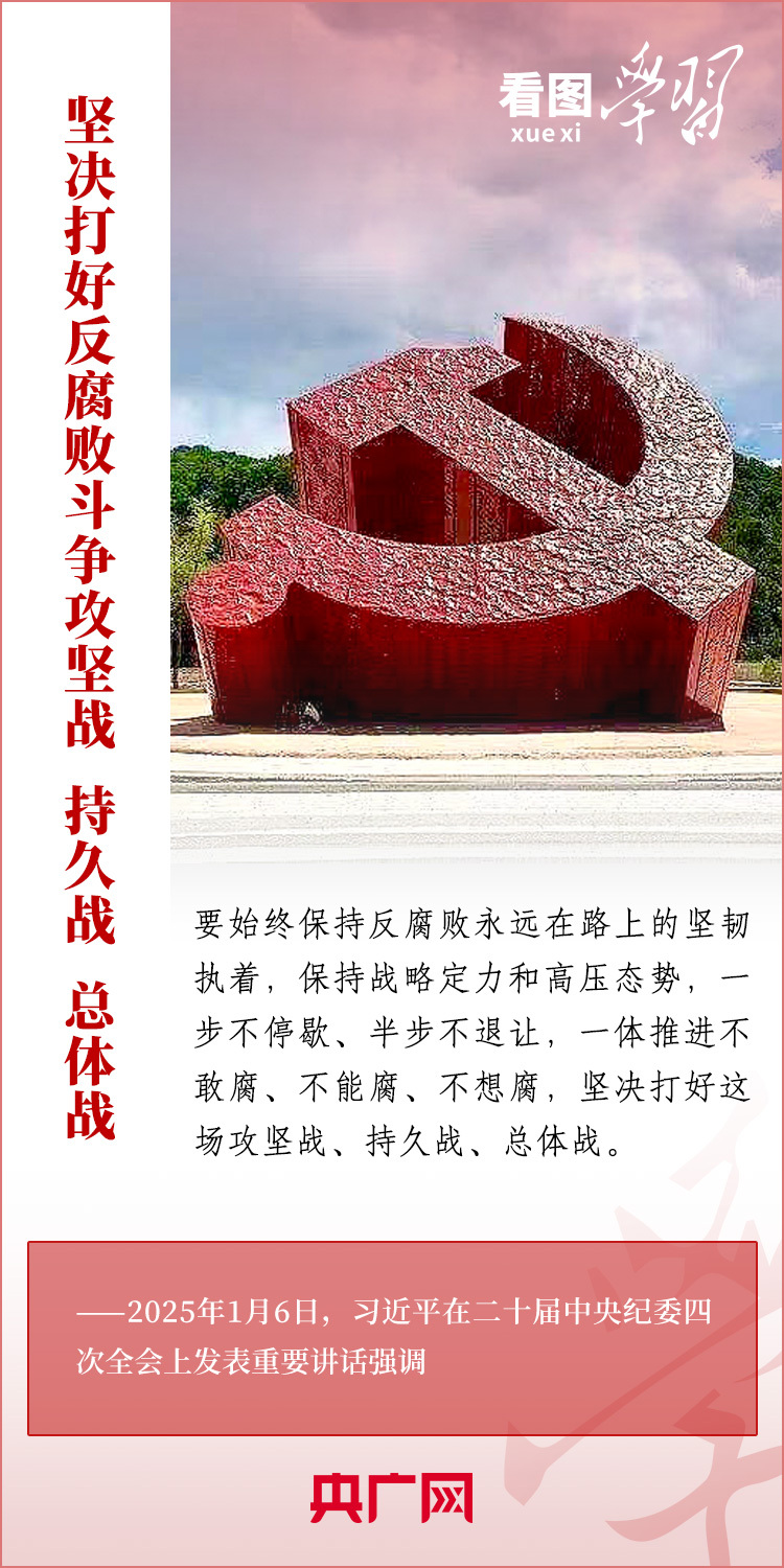 1月6日,習近平總書記在二十屆中央紀委四次全會上發(fā)表重要講話,充分肯定過去一年全面從嚴治黨取得的新進展、新成效,深刻分析當前反腐敗斗爭形勢,對堅決打好反腐敗斗爭攻堅戰(zhàn)、持久戰(zhàn)、總體戰(zhàn)提出明確要求??倳洀娬{(diào),新時代新征程,必須堅持用改革精神和嚴的標準管黨治黨,努力取得更大成效,確保黨的二十大和二十屆三中全會部署落地落實,確保黨始終成為中國特色社會主義事業(yè)的堅強領(lǐng)導核心,推動中國式現(xiàn)代化行穩(wěn)致遠。一起來學習!