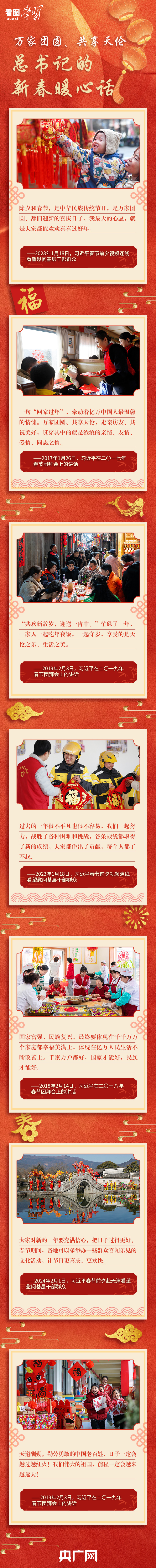 “共歡新故歲,迎送一宵中?!弊鳛橹腥A民族的傳統(tǒng)節(jié)日,除夕和春節(jié)是萬家團圓、辭舊迎新最重要的日子。每年春節(jié)前夕,習(xí)近平總書記都要看望慰問各地基層干部群眾,向全國各族人民送上新春祝福。