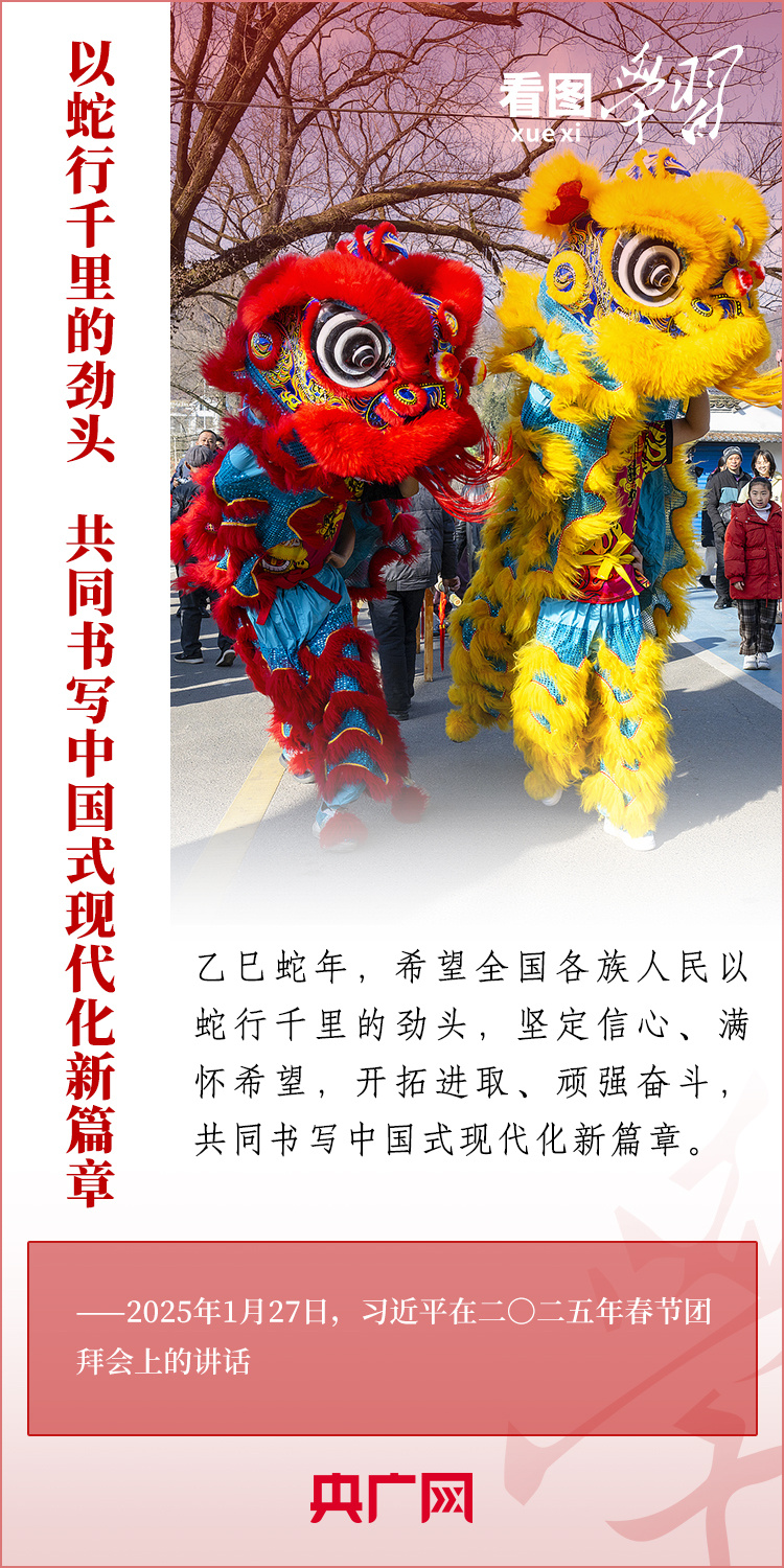 1月27日,中共中央、國務(wù)院在北京舉行春節(jié)團(tuán)拜會(huì),習(xí)近平總書記發(fā)表熱情洋溢的講話,向全國各族人民、港澳臺(tái)同胞、海外僑胞拜年并致以新春祝福。總書記在講話中深情回顧過去一年中國式現(xiàn)代化取得很不平凡的發(fā)展歷程,“希望全國各族人民以蛇行千里的勁頭,堅(jiān)定信心、滿懷希望,開拓進(jìn)取、頑強(qiáng)奮斗,共同書寫中國式現(xiàn)代化新篇章?!币黄饋韺W(xué)習(xí)!