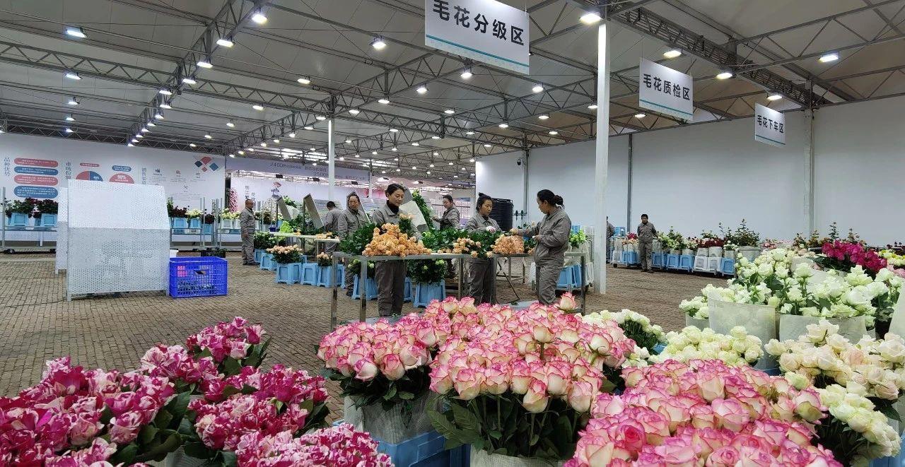△云南麗江現代花卉產業(yè)園內,工人正在分類整理鮮花。
