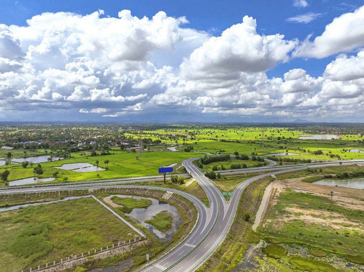 這是2024年9月25日在柬埔寨磅士卑省拍攝的金港高速公路(無人機照片)。金港高速公路是中國路橋工程有限責(zé)任公司(中國路橋)按“建造-運營-移交”模式投資的項目。