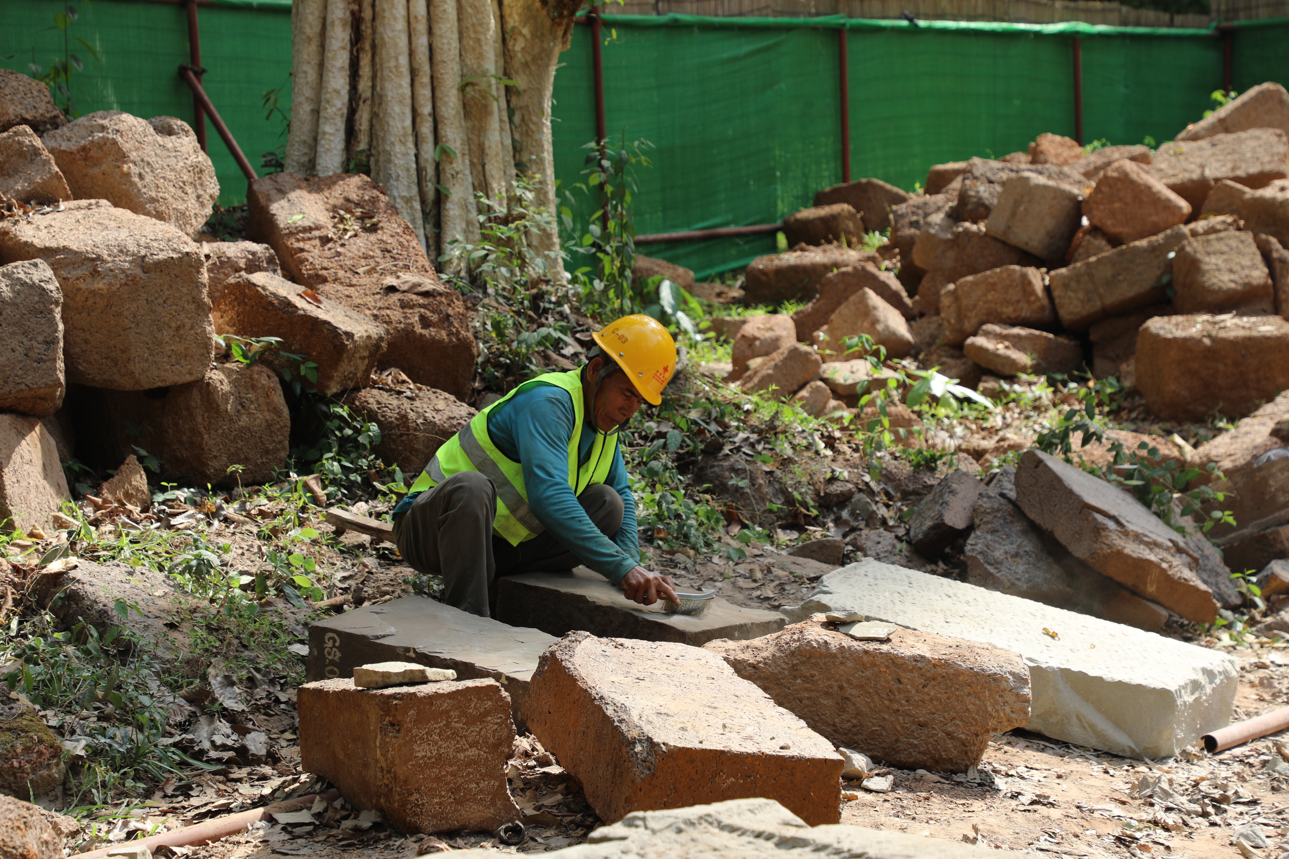 一名柬埔寨工人正在王宮遺址修復現場工作。(人民日報記者曹師韻 攝)