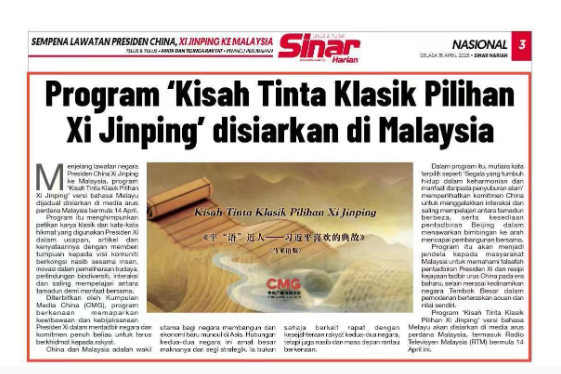 4月15日,馬來西亞中文、英文、馬來文主流媒體《星洲日報》《星報》《陽光日報》分別刊發(fā)節(jié)目在馬來西亞落播的消息。文章指出,《平“語”近人——習(xí)近平喜歡的典故》(馬來語版)特別選取了“萬物各得其和以生,各得其養(yǎng)以成”等典故,生動闡釋中國堅持不同文明之間平等交流、互學(xué)互鑒,愿意為人類破解時代難題、實現(xiàn)共同發(fā)展提供強大的精神指引,有助于馬來西亞民眾更好讀懂新時代中國之治的成功密碼,感知中國式現(xiàn)代化蓬勃發(fā)展的強勁脈動。