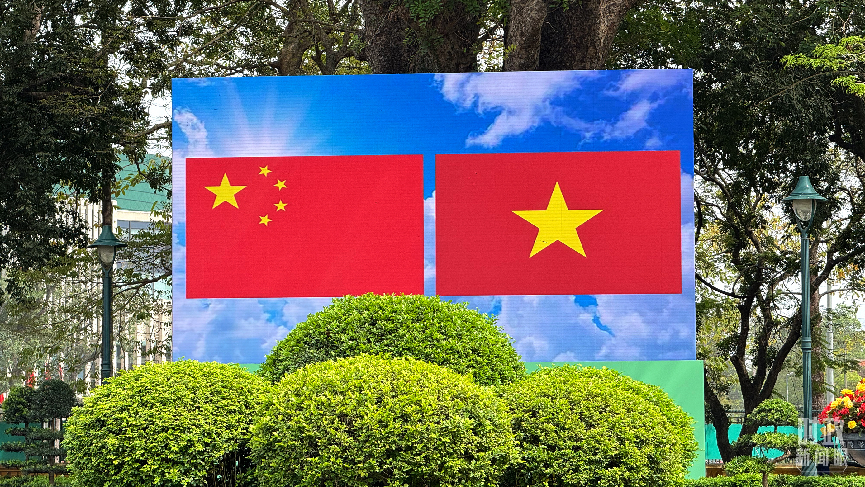 歡迎儀式現(xiàn)場(chǎng)大屏幕上展示的中越兩國(guó)國(guó)旗。(總臺(tái)央視記者蔣碩拍攝)