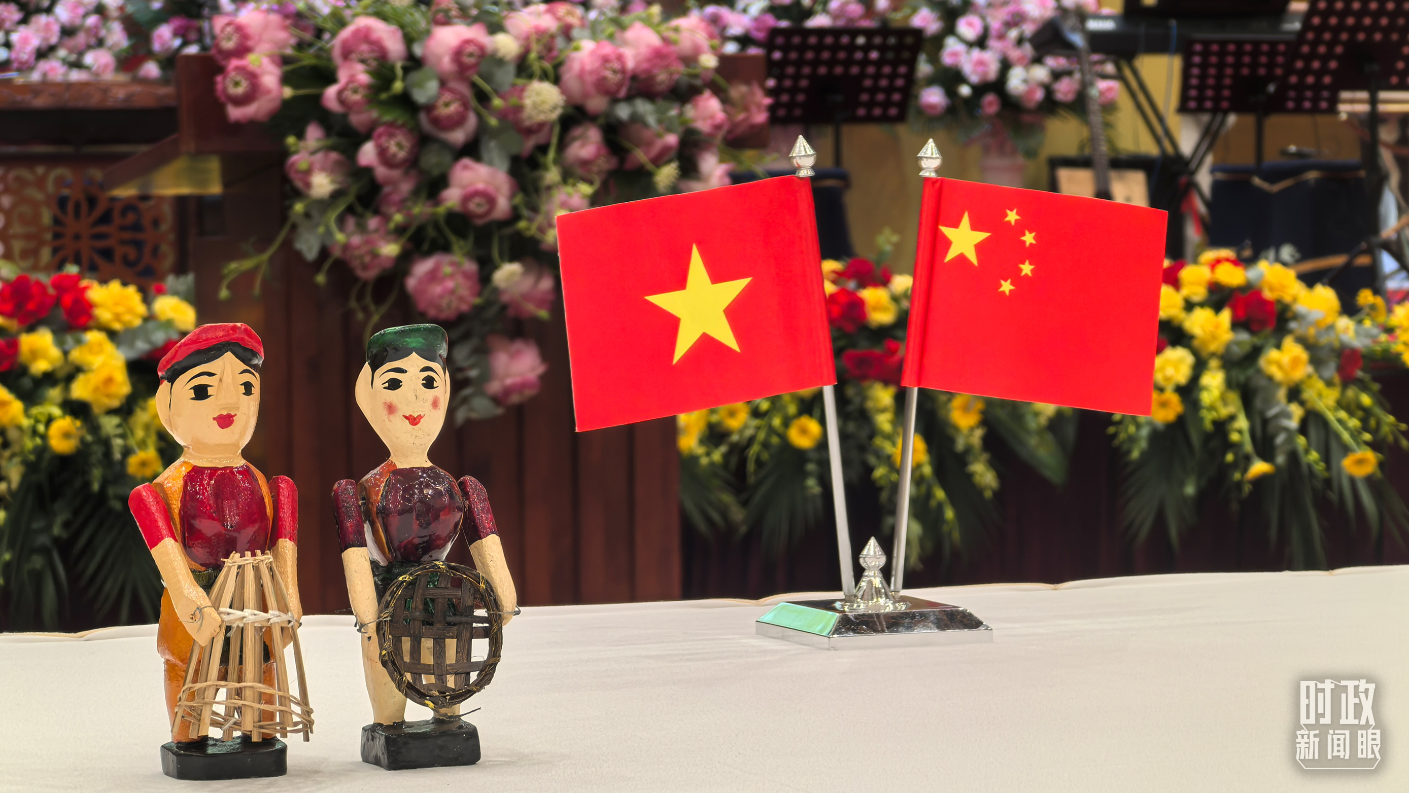 歡迎宴會(huì)現(xiàn)場(chǎng)擺放的中越兩國(guó)國(guó)旗。(總臺(tái)央視記者鄂介甫拍攝)