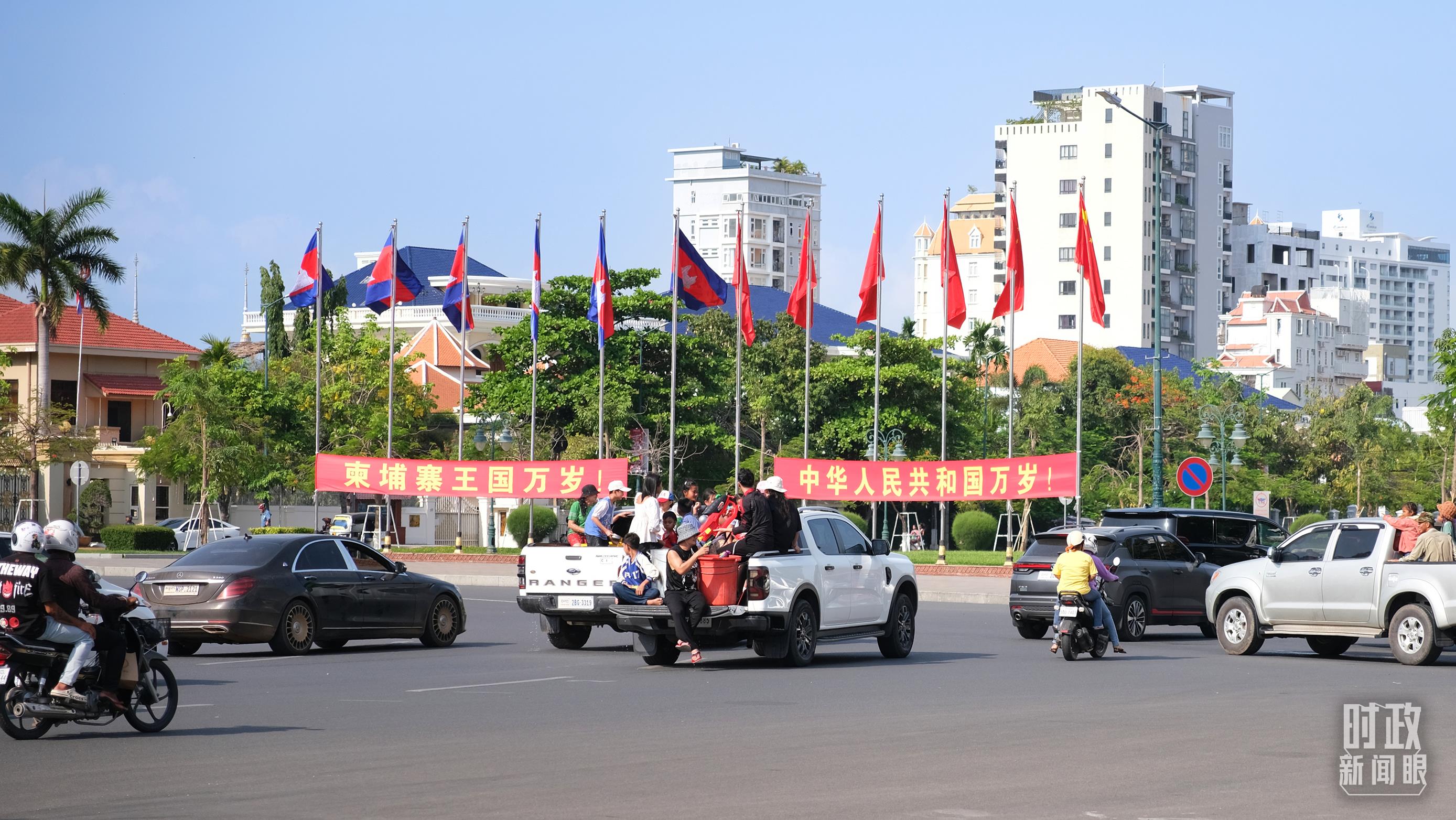 金邊街頭的兩國(guó)國(guó)旗和標(biāo)語。(總臺(tái)央視記者鄂介甫拍攝)